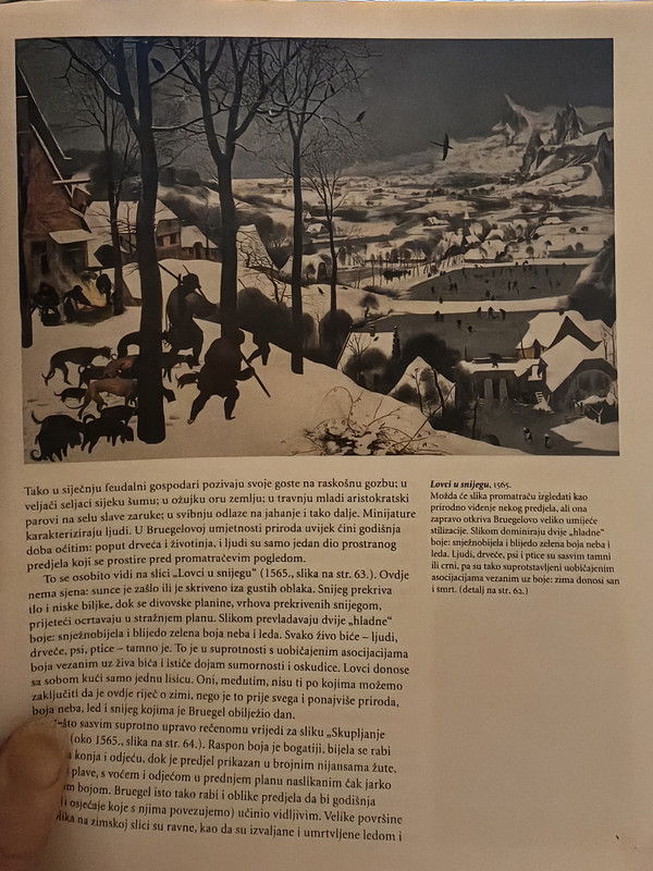 Umorni i bez ulova, lovci se tmurno vraćaju u selo utonulo u zimu. Zima je godišnje doba s dva lica, na jednom idila bijelih pejzaža, vesele dječje igre u snijegu i toplina seoskih kućica i naloženih vatri, a na drugom zaleđene zelene vode, prijetnja gladi i smrzavanja, surovost i nesigurnost života. Bruegel slika tjeskobu ispod idile. Slika kojoj se uvijek vraćam proučavati ju, kad zamiriši na snijeg, u neki zimski sumrak, kao Alisa zemlji čudesa.
