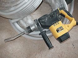 I na zadnjoj slici, ovih dana to mi je najbolja prijateljica: divan stroj (klasa polujeftikaner - kućni majstor), 6 kg, motor 1500W, 5,5 J snage udarca, obratite pažnju na dlijeto za udubljenje utora. Treba mi oko 20 sekundi za 2 m zida. Znam, netko će reći da je elegantnije utore raditi s frezom, no ovako mi ide brže i manje se praši.