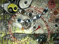 Počeo sam nedavno slikati, u novoj tehnici. Ovo je prvi rad. Završio je tako (iako slika nikad nije konačna), a mogao je drugačije. Dobro je u slikarstvu zadati si neku jasnu temu, a još bolje neku priču. Sve se može ispričati crtama, sjenama, oblicima, bojama. Ponekad lakše nego riječima, glasovima, slovima...Ova slika prikazuje Buddhine oči, oči živih bića: ptica, riba, pčela, mrava, morskih pasa, krokodila (na slici je zaronio ispod površine)... Neretvanska lađa je prazna. Ukrcajte se... Neka maraton počne... |