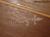 Neki dan sam ga ugledao na kuhinjskome stropu. Nepomično je stajao i promatrao mog starog dok je prao suđe. Snimio sam najprije nekoliko fotografija bez bljeskalice, a nakon ove je, uz čudan zvuk, pobjegao iza zidnih ormarića. Kasnije ga nisam vidio. Ostavio sam otvorene prozore, da može ujutro izići.Macaklin je zaštićena životinjska vrsta. Spominje se i u Bibliji... |