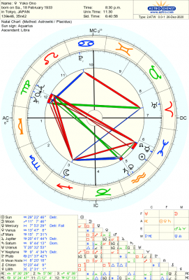 ovan je ratoboran, ali je Mars slab. Osobine Sunca u vagi u sedmoj kući su pojačane jer je Sunce u konjunkciji sa sjevernim Mjesečevim čvorom i voli mir. Lennon se cijeli život borio za mir u svijetu. Njegova borba nije nasilna. Ovo «u svijetu» opisuje Mjesec u vodenjaku, u 11-oj kući, koji je kozmopolita, njega ne zanimaju pojedinci nego društvo. U Lennonovom horoskopu prevladava element zemlje fiksne kvalitete, pa je završni pečat horoskopa bik. Bik upravlja grlom, prirodni je vladar druge kuće i nije čudno da mnogi pjevači imaju istaknut znak bika, a ujedno i dobro zarađuju. O velikoj popularnosti govori Sunce na vrhu sedme kuće i brojni Mjesečevi aspekti, između ostalog trigon Marsa (vladara horoskopa) i Mjeseca (narod, žene). Sedma kuća, opisuje prvi brak. Od prve žene Cynthie Powell, razveo se 1968, nakon što je upoznao Yoko Onno 1966., svoju drugu suprugu, kojom se oženio 1969. A onda je došlo do raspada Beatlesa 1970. Te sve događaje možemo povezati sa Saturnovim povratkom. Njegov natalni Saturn je u opoziciji sa Merkurom u sedmoj kući i trigonu sa Venerom (vladaricom sedme) u šestoj. Drugi brak je prikazan kroz devetu kuću. Vladar devete - Jupiter je u prvoj, u konjunkciji sa Saturnom i upućuje na brak sa strankinjom (Saturn = stranac, stariji, razveden, vodenjak). Yoko je od njega bila starija sedam godina i njoj je to bio drugi brak. Njenog drugog muža (Lennona) prikazuje Merkur u ribama (umjetnik), u konj. sa sjevernim Mjesečevim čvorom i Suncem. Merkur je u opoziciji sa Marsom, pa po tome možemo zaključiti da bi drugi muž mogao stradati ili biti u opasnosti na neki način. Također, vladar osme kuće od devete (smrt drugog muža), Saturn je u inkonjunkciji sa Marsom. Na jaku vezu Lennona i Yoko ukazuje to što ona ima Ascendent u znaku vage, a Sunce na kraju vodenjaka. Lennonov Mjesec je u konj. sa njenom Venerom i Saturnom. Njegova Venera je u djevici, kao i njen Mars u konj. sa Neptunom. Ne treba zaboraviti da su Venera i Mars kod njih vladari prve i sedme kuće. Merkuri su im u trigonu (škorpion-ribe) odlično razumijevanje. U Lennonovom horoskopu imamo trigon Venere i Saturna, a u Yokinom konjunkciju Venere i Saturna. Oni se razumiju po pitanju ljubavnih trauma, ali on je bolje prošao. Oznake: john lennon, yoko ono, astrologija |