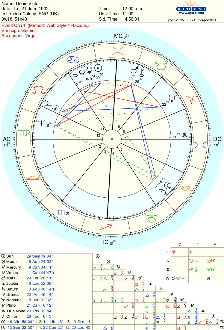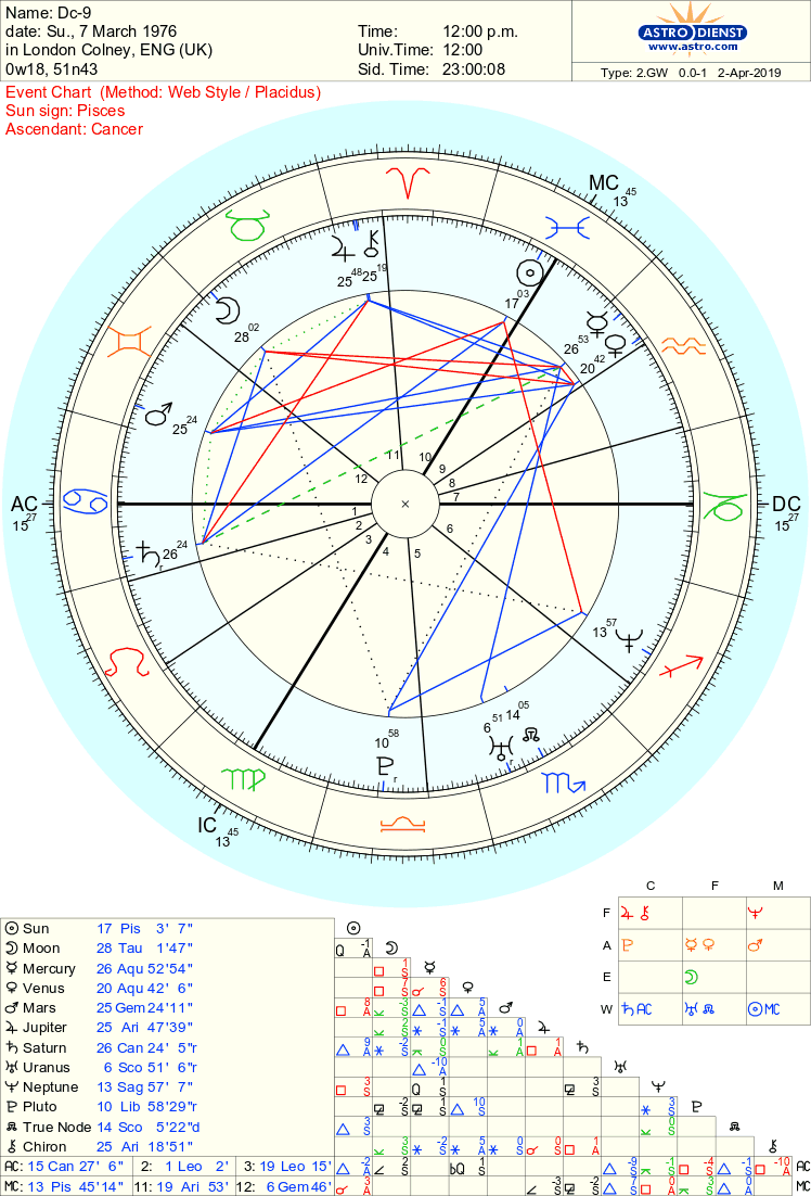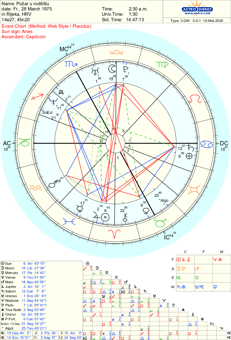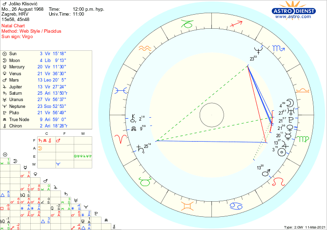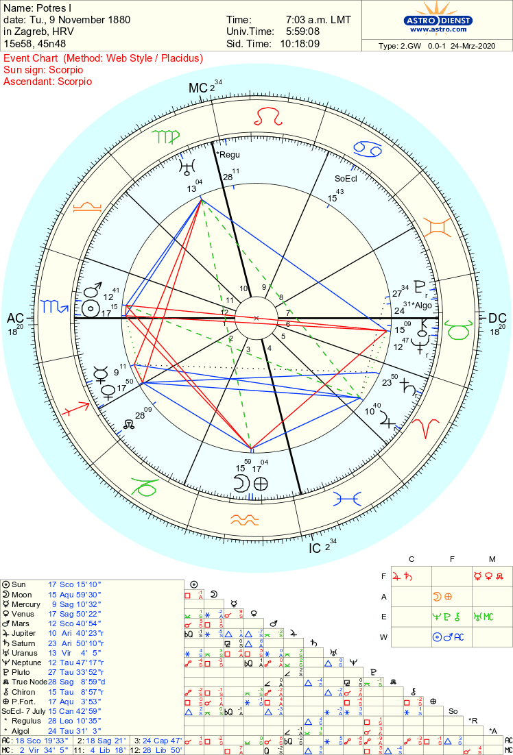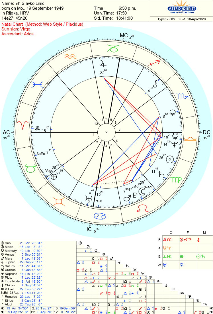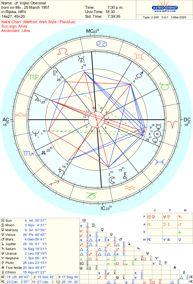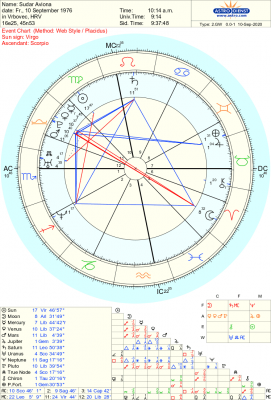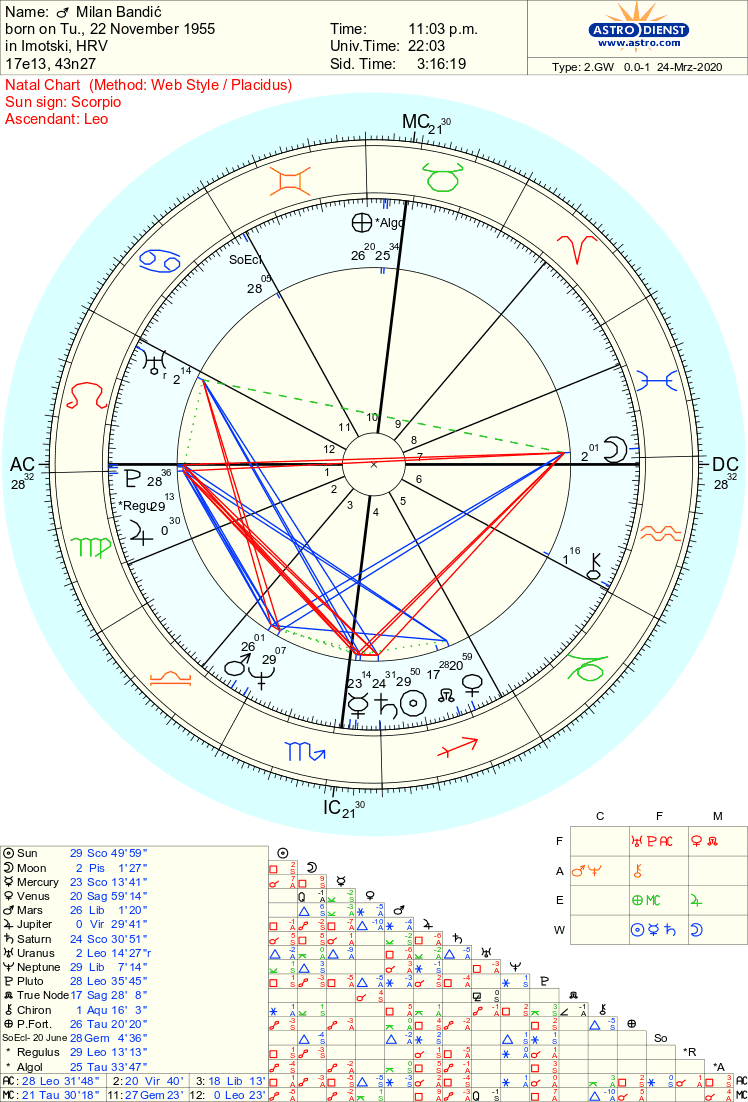 Za nesreću je optužen kontrolor leta Gradimir Tasić rođen 29.4.1949. u Nišu, nažalost nemamo podatke o vremenu rođenja. Osuđen je na 7 godina zatvora, ali je oslobođen nakon 2 godine i tri mjeseca. Tasićev horoskop obilježava stelij od pet planeta u znaku bika. Venera se nalazi u sjedištu i upravlja svim planetima osim Marsa na samom kraju znaka ovna (sjedište). Sunce je u kvadratu sa Plutonom, a Mjesec sa Saturnom. Pilot Tridenta bio je Tann Denis Victor, rođen 21.6.1932., a pilot DC-9 bio je Krumpak Jože, rođen 11.03.1925. Trident je proizveden 5.6.1972., a DC-9 7.3.1976. Zanimljivo je da su oba pilota vozila avione sa istim sunčevim znakom (blizanci i ribe), još je zanimljivije da Mjesec Tridenta pada u znak ribe, a Mjesec DC-9 u znak blizanaca. Tridentovo Sunce je u konjunkciji sa Saturnom, a DC-9 ima Sunce u kvadratu sa Marsom. DC-9 je bio bolji avion. Ovim horoskopom dominira element zrak, kardinalne kvalitete, tj. vaga. Oba vladara asc. (škorpion), Mars i Pluton su u bliskoj konjunkciji zajedno sa Venerom (Venera je uklještena) koja je konačni dispozitor horoskopa (planeta u sjedištu, koja vlada svim planetama). Njih troje nalaze se na vrhu zmaja, u opoziciji sa Mjesecom u ovnu (njime vlada Mars). Druga važna stvar je egzaktna konjunkcija Urana i mjesečevog čvora. Ta konjunkcija je u kvadratu sa Saturnom (bog vremena) vladarom treće kuće (avion). Zapažamo kako su Mars (sudar), Saturn (vrijeme) i Neptun (nesporazum) na istom 11ş. https://assets.publishing.service.gov.uk/media/5422ffeeed915d1374000a11/9-1982_G-AWZT_and_YU-AJR.pdf Napomena: Horoskop za sudar je izrađen za vrijeme 10:14 GMT, lokalno vrijeme je 11:14. U tom slučaju Asc.pada na 22 stupnja škorpiona, a Mjesec se nalazi točno na osi 5.kuće. Zbog tehničkih problema ne mogu dodati točan horoskop. Oznake: Sudar aviona, Vrbovec, astrologija |