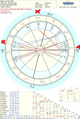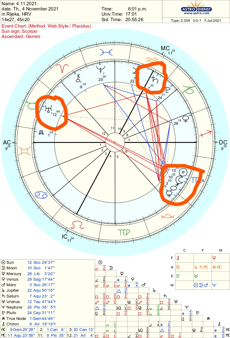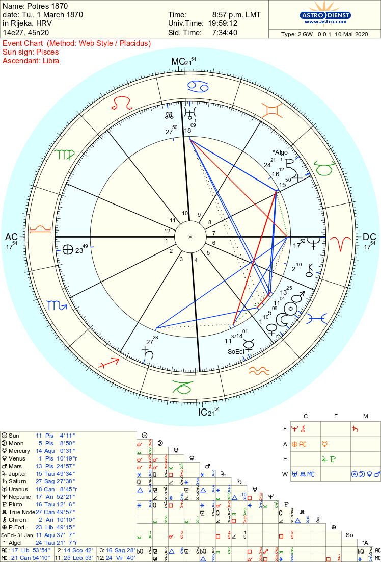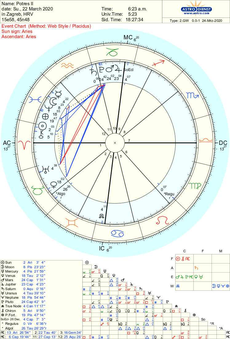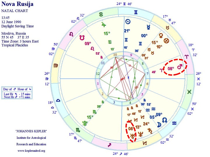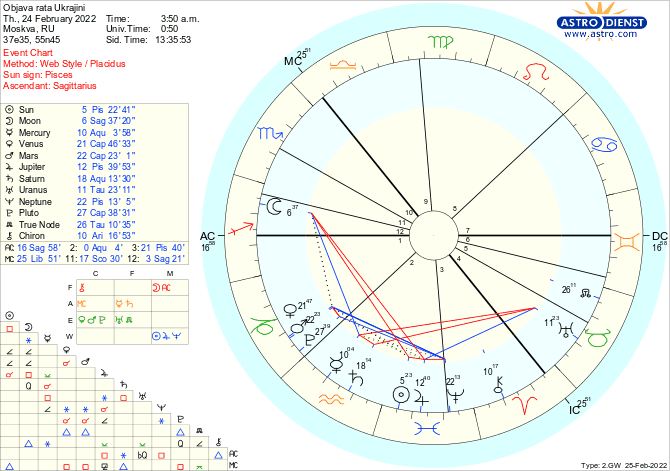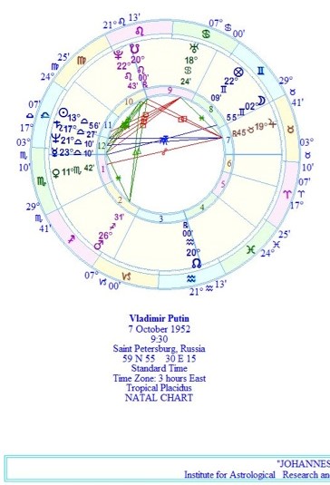 Kako je Jovetić došao do tih zaključaka? Pitanjima ratova i politike bavi se mundana astrologija. Sada kada je rat započeo lako je reći, aha Mars je u konjunkciji sa Plutonom u jarcu. Mars je bio u konjunkciji sa Plutonom u jarcu u travnju 2018. pa se nije ništa desilo. Pogledajmo horoskop nove Rusije i usporedimo ga sa horoskopom Vladimira Putina. A zatim pogledajmo tranzite na dan početka rata. Nakon toga trebalo bi pogledati horoskop Ukrajine i Zelenskoga, pa bi trebalo osim tranzita pogledati progresije, eklipse, solarne povratke itd. Zanimljivo bi bilo usporediti horoskop SAD i Rusije. Sve u svemu ogroman posao, a pogriješiti je vrlo lako. Nova Rusija ima Ascendent na 26°djevice, vladar horoskopa, Merkur je na 0°bilzanaca (sjedište). Rusija ima Merkur, Veneru, Mars, Saturn i Pluton u sjedištu što govori o moćnoj državi. Mjesec (u horoskopu zemlje predstavlja narod) u konjunkciji sa mjesečevim čvorom ima veliku snagu. Znak vodenjaka govori o narodu koji teži ravnopravnosti, jednakosti, slobodi i revoluciji, o društvu u kojem pojedinac nije važan. Sunce (kralj) je na Zenitu u znaku blizanaca. Ovaj položaj daje lukavog vladara. O bogatstvu zemlje govori Venera u biku u opoziciji sa Plutonom. Vladimir Putin ima Ascendent na 3°škorpiona, a Mars 26°strijelca (opozicija na Zenitom Rusije). Njegov Mjesec je u blizancima. Sunce i još tri planete su u znaku vage u 2.kući Rusije, znači da on povećava njeno bogatstvo. Na Zenitu ima Pluton u konjunkciji sa mjesečevim čvorom. Mjesečevi čvorovi jako povećavaju snagu planete, a Pluton ima silnu želju za moć. Ovo je pokazatelj izuzetno moćne osobe. Putina je na rat vjerojatno natjerao, između ostaloga, tranzitni Uran (11°bik) u opoziciji sa njegovom Venerom (11°škorpion), koja vlada planetama u vagi. Iako će tranzitni Saturn (19°vodenjak) dugo vremena raditi dobre aspekte na njegove planete u vagi, istovremeno će raditi i kvadrat na njegov Jupiter (19°bik), što znači da će imati znatne financijske gubitke i da će često precjenjivati svoje mogućnosti. Putin je objavio rat Ukrajini 24.2.2022. negdje prije 4 ujutro. Tranzitni Mjesec prolazio je kroz strijelca, nasuprot Putinovog Mjeseca, a zatim i Sunca Rusije. Tranzitni Mars i Venera prolaze kroz četvrtu kuću Rusije, preko njenog Saturna. Ovo nisu neki jaki tranziti. Možda mi se oči otvore za koji dan. Usporedba horoskopa Rusije i Putina je još jedan dokaz da ne može bilo tko biti predsjednik bilo čega. Samo osobe čiji horoskopi se poklapaju sa horoskopom države u određenom trenutku mogu postati njeni vladari. Još jedna napomena, Rusija se tradicionalno vezuje uz znak vodenjaka, a Kina uz znak vage. Vodenjak i vaga se jako dobro slažu. Veoma dugi boravak Marsa u ovnu od srpnja 2020. do siječnja 2021. može ukazivati na pripreme Rusije za rat. Eklipsa u prosincu 2020 na 23° strijelca (Nadir Rusije) je označila početak nečeg važnog, dolazak Bidena na vlast? U kolovozu 2022. Mars ulazi u znak blizanaca gdje će boraviti neobično dugo do ožujka 2023. Jupiter ulazi u znak ovna u lipnju 2022 i biti će tamo do svibnja 2023. To je važno jer je Sunce Rusije u blizancima, a Mars u ovnu. Ovi aspekti potiču ratnu energiju Rusije. Saturn šalje Rusiji dobre vibracije do veljače 2023. Po tranzitima možemo zaključiti da će Rusija pobjeđivati do prve polovice 2023. Tu je još jedna kvaka da SAD imaju Ascendent u blizancima, a Mjesec također u vodenjaku. Ove dvije činjenice kažu da SAD i Rusija neće nikad međusobno ratovati, oni su partneri. Možda jedanput obradim horoskop Zelenskoga i kako je naivno nasjeo lažima blizanaca, Oznake: astrologija, Ukrajina. Putin |