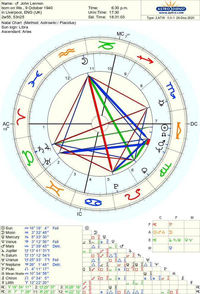John Lennon rođen je sa Suncem u znaku vage, Mjesecom u znaku vodenjaka i Ascendentom u ovnu. Vladar horoskopa, Mars nalazi se u vagi, u izgonu.