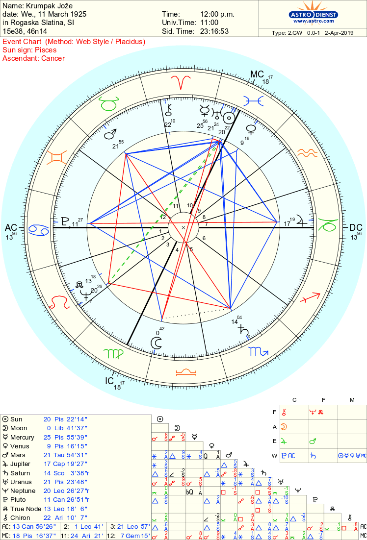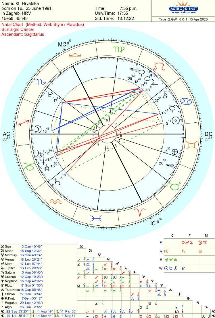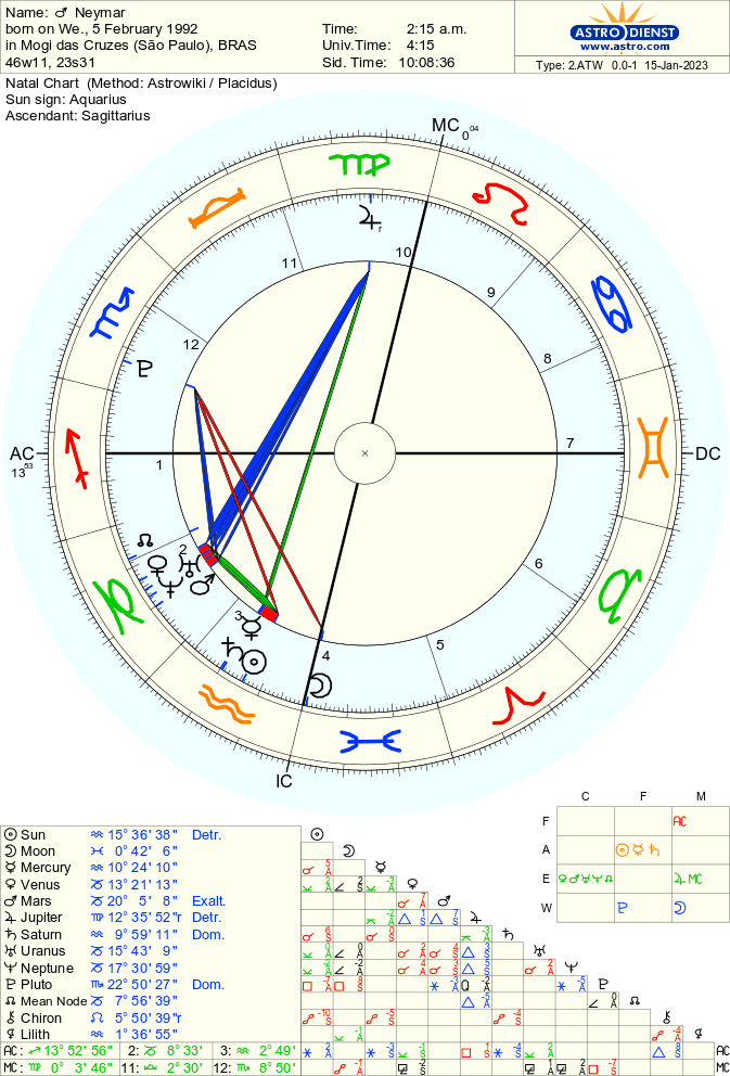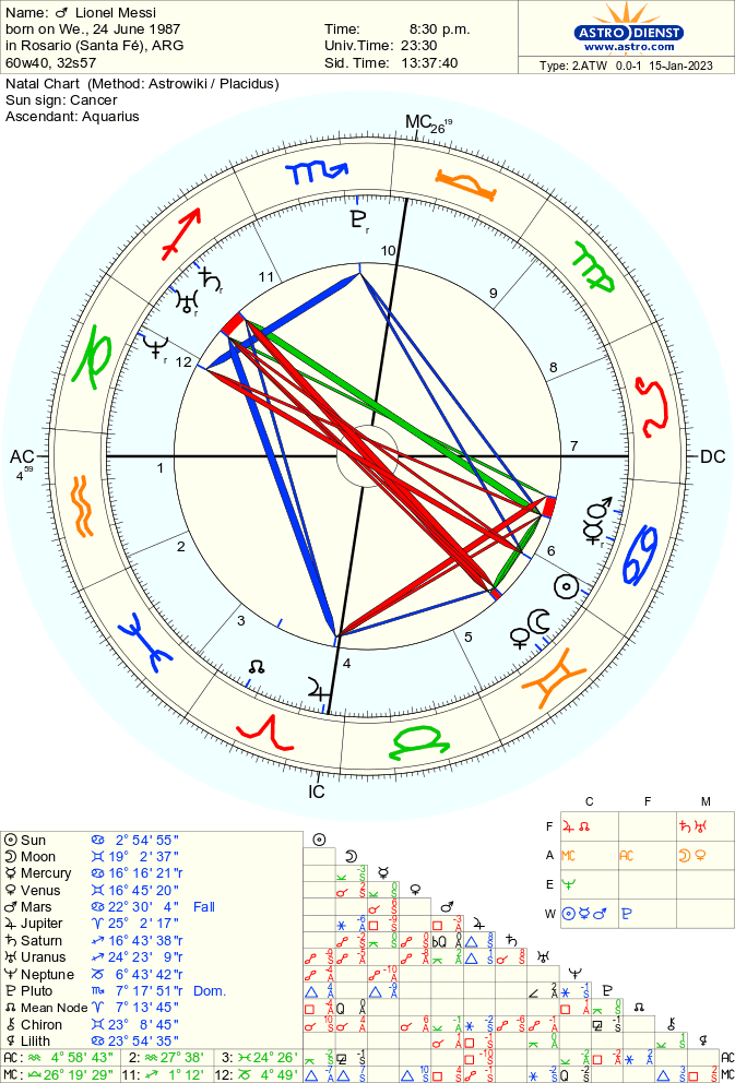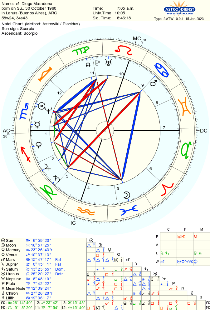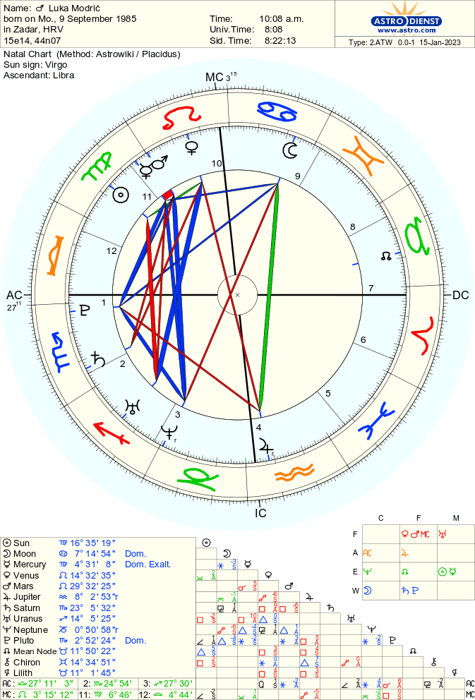 Smatram da mu je Mjesec u znaku raka zato jer je za vrhunske sportaše odličan vid presudan faktor za postizanje rezultata, a to ću i dokazati kroz analizu horoskopa nekih vrhunskih nogometaša. Svi imaju dobro položen Mjesec, istaknut znak raka ili jaku četvrtu kuću. Nabrojani sportaši imaju različite karaktere i sudbine ali zajednički su im rezultati u nogometu, slava i bogatstvo. Diego Maradona, argentinski igrač koji je dobar dio karijere proveo igrajući u talijanskim klubovima, ženskar, otac navodno jedanaestero djece. Umro u 61. godini od posljedica upotrebe droga i lijekova. Krenuti ćemo od najvažnije točke u horoskopu, a to je ascendent u znaku škorpiona, gdje se nalazi i Merkur. Vladar horoskopa (Mars) je u znaku raka, a Mjesec u konjunkciji sa južnim mjesečevim čvorom u ribama u 5. kući (plodnost). Vladar 4.kuće (Saturn) je u sjedištu i opoziciji sa Marsom, a nalazi se na vrhu 3. kuće. Lionel Messi, argentinski igrač koji se sa 13 godina preselio u Barcelonu. Za sada sretno oženjen, ima troje djece. Sunce, Mars i Merkur nalaze se u znaku raka. Mjesec je u recepciji sa Merkurom i vlada Marsom i Suncem. Jupiter je na vrhu 4. kuće i vlada vladarom horoskopa. Neymar de Silva Santos, brazilski igrač, trenutno igra u Francuskoj, prate ga brojni ljubavni tračevi, a već ima jedno vanbračno dijete. Mjesec se nalazi točno na vrhu 4. kuće (slučajno sjedište) u znaku riba. Vladar 4., a ujedno i horoskopa je Jupiter. Merkur je u 3. (slučajno sjedište) skupa sa Suncem i Saturnom. Kylian Mbappe, francuski igrač, afričkog porijekla Mjesec je skupa sa vladaricom horoskopa na vrhu 4. kuće. Mars je na ascendentu (slučajno sjedište) i vlada vladarom 4. kuće. Merkur je na vrhu 3. kuće (slučajno sjedište). Jupiter je u sjedištu. O ovom igraču ćemo još puno slušati. Luka Modrić. Hrvatski igrač, trenutno igra u Španiji, oženjen, troje djece. Mjesec se nalazi u znaku raka, a Jupiter je na vrhu 4. kuće. Merkur je u djevici u sjedištu i vlada Suncem koje vlada Marsom. Iz navedenih primjera može se zaključiti da je za nogometaše važan znak djevice i raka, od kuća 1., 3., i 4. a od planeta Mars, Mjesec, Merkur. Jaki Mjesec vlada Marsom, vid upravlja mišićima. Merkur naglašava brzinu misli i okretnost. Oznake: nogomet, astrologija |