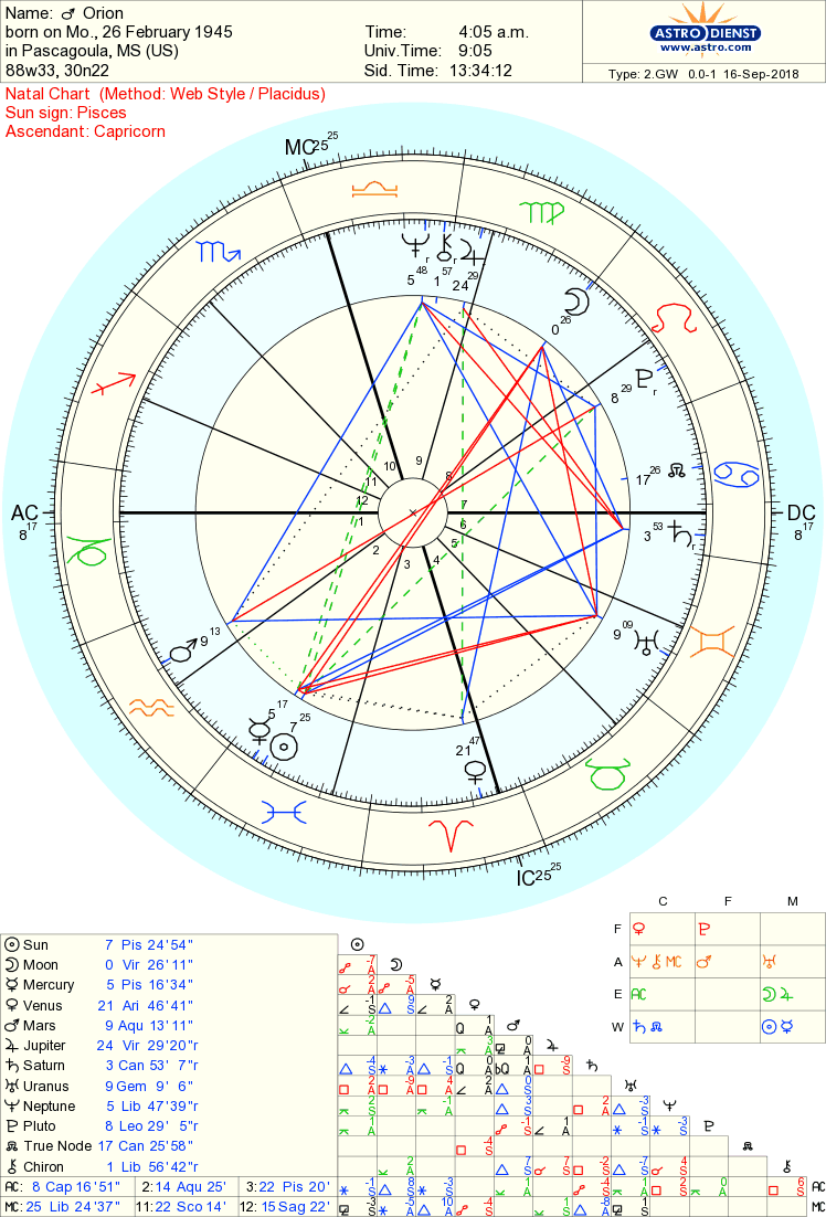 Rodio se u Pascaguoli, u Missisippiu (SAD), 26.2.1945. g., a majka Gladys ga je ostavila u sirotištu kada je imao dvije godine. Usvojio ga je R. F. Ellis sa svojom ženom Mary Faye, stoga mu je prezime promijenjeno u Ellis. Već tu zapažamo neke zanimljivosti, npr. Jimmyeva majka se zvala Gladys, a otac Vernon, isto kao i Elvisovi roditelji. Bio je dobar učenik i sportaš, te je dobio sportsku stipendiju. Bavio se uzgojem vrhunskih konja i u tome bio veoma uspješan (prema istoimenom dokumentarnom filmu, uzgojio je tri svjetska šampiona), ali je ljubav prema glazbi bila jača. Lik Oriona kreiran je odmah nakon Elvisove smrti, na temelju priče Gail Brewer-Giorgo o rock and roll pjevaču, koji je odglumio vlastitu smrt, navodeći neke da povjeruju kako je Orion istinita priča o Elvisu. Orionov debi album iz 1979. g. pod naslovom «Ponovno rođen» na naslovnici je imao Ellisovu sliku sa maskom preko očiju i znakom upitnika, a pjesme su zvučale u Elvisovom stilu. 1983.g. Ellis je javno priznao da je on Orion, napustio je izdavačku kuću (Sun records) i nije više nastupao kao Orion do 1990.-tih. 12.12.1998. g. ubijen je u svojoj zalagaonici za vrijeme pljačke. Život mu je bio u opasnosti i 1987. g. kada je upitao dvojcu muškaraca za put do restorana. Ranili su ga pri bijegu zbog sumnje da je policajac. Mit o Orionu govori o najljepšem živom čovjeku, lovcu, kojeg je oslijepio Ojnojpion, nakon što mu je Orion silovao kćer. Helije mu je vratio očni vid, a nakon što je pokušao zavesti Artemidu (božicu lova i Mjeseca) napala ga je škorpija. Artemida, prevarena od Apolona (bog umjetnosti i Sunca), ubija Oriona i radi toga gorko žali, te ga stavlja na nebo. Ovaj mit, pun simbolike ukratko sažima Jimmyevu sudbinu. Svoj javni život proveo je pod maskom, sakrivenih očiju, pjevajući za Sun records (Helij). Žene se ga obožavale kao i Elvisa. Nakon što je preživio prvi napad, ubijen je i uzdignut među zvijezde. Pojam «ponovno rođen» možemo povezati sa znakom škorpiona (regeneracija). Nažalost, nemamo podatak o točnom vremenu rođenja. Horoskop u prilogu izračunat je za pretpostavljeno vrijeme 3:45 ujutro. Stalno treba imati na umu da je Ascendent, najvažnija točka horoskopa, nepoznat. Usprkos manjkavim podatcima usporedimo horoskop Elvisa Presleya i Jimmya Hughesa Bella. Jimmy se rodio za punog Mjeseca. Sunce je u konjukciji sa Merkurom kao i kod Elvisa. Sunce se nalazi u znaku Ribe, gdje se nalazi Elvisov Mjesec. Zanimljivo je pogledati Jimmyev južni Mjesečev čvor na Elvisovom Suncu i Merkuru. Merkur i Jupiter su zamijenili sjedišta. Elvisovim horoskopom dominira moćni Saturn, koji je u Jimmyevom horoskopu u padu. Elvisu je na Asc. znak strijelca. Jimmy se bavio konjima, u svakom slučaju i u njegovom horoskopu mora biti naglašen Jupiter, znak strijelca ili Neptun (zaštitnik konja). Na nasilnu smrt upućivala bi opozicija Mars Pluton, koja je uključena u konfiguraciju zmaja. Uran u kvadratu sa Suncem i Mjesecom govori o roditeljima koji su napustili svoje dijete. U njegovom horoskopu nalazimo četiri planete u padu (Venera, Saturn, Jupiter i Merkur), jedino je Mars jak, a u Elvisovom je samo Mars u padu. Za ocjenu snage planete bitan je položaj po kućama, o kojem možemo samo spekulirati. Kako se radi o pjevaču treba pogledati znak bika (grlo), Veneru i drugu kuću. Ako pretpostavimo da je Sunce sa Merkurom u drugoj kući (kao i Elvisu), to bi značilo da je Asc. negdje u znaku jarca. U tom slučaju jaki Mars bi padao negdje oko vrha druge kuće, a Saturn tada vidimo pod drugim svjetlom, kao vladara horoskopa na vrhu sedme, što ukazuje na želju za popularnošću. Vladarica desete (Venera) nalazila bi se u četvrtoj kući, tu govorimo o situaciji u kojoj jedan roditelj preuzima ulogu oba roditelja (samohrana majka). Jupiter dobiva dodatnu snagu jer mu je u devetoj kući slučajno sjedište. Za vrijeme prvog napada 1987. g. tranzitni Pluton (na 7stupnjeva škorpiona) obrazovao je kvadrat na natalni Pluton i trigon na natalno Sunce, te tako aktivirao natalnu inkonjukciju Sunca i Plutona. Na dan ubojstva tranzitni Pluton (na 8 stupnjeva strijelca) je načinio trigon sa natalnim Plutonom i kvadrat na natalnim Suncem. Osim ove natalne inkonjukcije, koja je očigledno veoma važna, možemo zaključiti da je točka 27stupnjeva ovna osjetljiva, jer je pri prvom napadu tu bio tranzitni Jupiter, a pri drugom tranzitni Saturn. Na toj točki Elvis ima natalni Uran. Ukratko, previše slučajnosti. https://en.wikipedia.org/wiki/Jimmy_%22Orion%22_Ellis Oznake: astrologija |