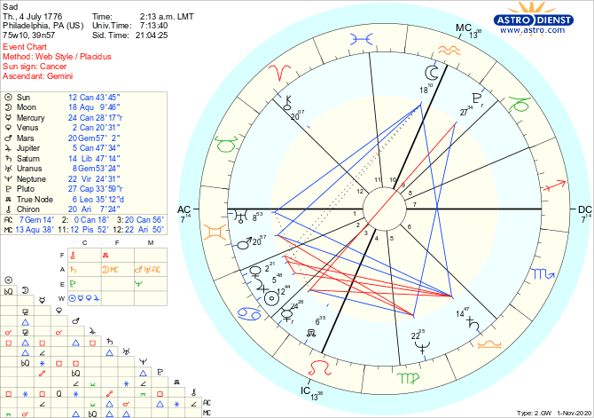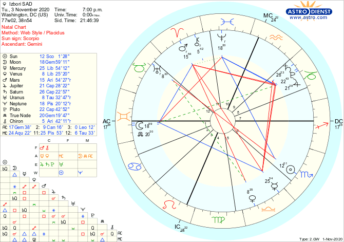 Prema Noelu Tylu SAD su nastale 4.7.1776. u Philadelphii, PA U 2,13 h. Ascendent se nalazi na 7° blizanaca, gdje se nalazi i Uran, a Merkur vladar horoskopa se nalazi na 24° raka. Sunce se nalazi na 12° raka, a Mjesec (vladar Sunca) na MC na 18° vodenjaka. O bogatstvu zemlje govore Sunce, Venera i Jupiter u drugoj kući, i vladar druge kuće Mjesec na MC. Sada nećemo ulaziti u duboke analize zašto je SAD vodeća svjetska sila i koliko dugo će to trajati Donald Trump rođen je 14.6.1946. u Queens County, NY u 10,54 h, za vrijeme pomrčine Mjeseca. Ascendent mu se nalazi na 29° lava, a tamo je i Mars. Vladar Asc. Sunce se nalazi na 22° blizanaca zajedno sa Uranom i sjevernim mjesečevim čvorom, na Marsu SAD. Mjesec je naravno u strijelcu. Njegov Merkur (vladar Sunca i Urana) se nalazi na 9° raka, u konjunkciji sa Suncem SAD, a Saturn i Venera se nalaze na Merkuru SAD (vladar horoskopa SAD). Joe Biden je rođen 20.11.1942 u Scranton, PA u 8,30 h. Njegov Ascendent je na 3° strijelca i pada na vrh 7. kuće SAD, što je jedan od pokazatelja da ima izglede postati predsjednik. Vladar horoskopa Jupiter je na 25° raka, na Merkuru SAD. Njegovi planeti u škorpionu su u dobrim aspektima sa planetima SAD u raku, ali nisu u dobrim aspektima prema Mjesecu SAD, pa bi se moglo zaključiti da ga narod baš i ne voli. Mjesec je skloniji Trumpu. Bidenu više odgovara rad u pozadini. Aspekti na dan zatvaranja birališta su slijedeći: zanimljivo da je Asc. Na 17° blizanaca, a tamo su i Mjesec i mjesečev čvor, na Marsu SAD i Suncu Trumpa. Merkur je na 25° vage, u povoljnom aspektu na Trumpovo Sunce. Tranzitno Sunce u škorpionu daje prednost Bidenu. Presuditi će konjunkcija Jupitera, Saturna i Plutona na 22° jarca u opoziciji sa Merkurom SAD. Ovaj stelij govori da se SAD nalazi na prekretnici, dolazi do velikih promjena koje neće biti ugodne, više ništa neće biti kao prije. Za Bidena je ovaj stelij pozitivan, dobiti će veliku snagu i moć, dok Trump može očekivati probleme i pad. Biden će imati snage provesti SAD kroz vrijeme krize, to Trump ne bi mogao iako mu je narod skloniji nego Bidenu. Ovo je samo površna, brzinska analiza analiza, nisu razmatrani solarni povratci itd. Oznake: astrologija, izbori, SAD, trump, Biden |
