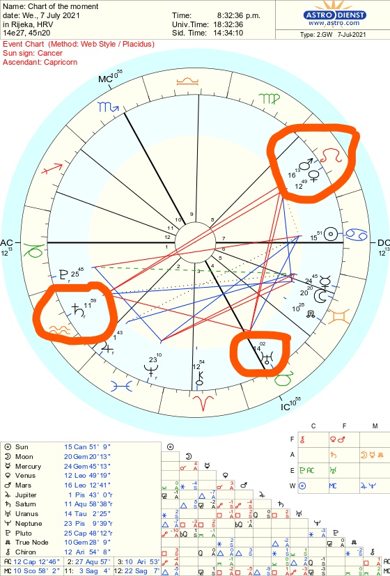 Ovo je teška konstelacija, nasilna. Dok se sve odvija u našoj glavi, dobro je. Na vijestima danas kažu ubijen je haićanski predsjednik, a žena mu je ranjena, napadnut je nizozemski novinar koji je svjedočio protiv kriminala. Ljude se pokušava prisiliti na cijepljenje nedovoljno ispitanim cjepivima. Puno loših i ružnih vijesti, a bit će još. Utjecaj ovog T-kvadrata će se osjećati još oko tjedan dana, ali ovo je samo početak procesa koji će trajati još godinu dana. Najgore će biti u 11/21 kada Mars bude u škorpionu i ponovno formira T-kvadrat sa Saturnom i Uranom. Saturn predstavlja stare okoštale strukture, a Uran ih razara. Sve što je dotrajalo će propasti. Dotrajali auto će otići na otpad, loši brakovi će se raspasti, radnici će mijenjati poslove ne svojom voljom, stari će umirati više od prosjeka. Ono što mi možemo je prihvatiti stanje takvo kakvo je, jer nekim situacijama ne možemo upravljati. Proći će. Bitno je znati da slijedećih godinu dana nije dobro započinjati važne poslove, jer će loše završiti. U nastavku dajem odlomak iz knjige Stephena Arroyoa, Astrologija, karma i transformacija Umijeće izostavljanja savjeta str.235 „Premda bi većina astrologa vjerojatno mogla smatrati da im je prvenstvena dužnost da svojim klijentima daju specifične odgovore i premda bez sumnje mnogo ljudi misli da odlaze astrologu po savjet, osobno imam neke ozbiljne rezerve u pogledu prakse odveć površnog savjetovanja drugima što da rade i što da ne rade. Prije svega trebamo sami sebe čestito upitati znamo li doista što određena osoba treba raditi.” „Možemo se pitati, što je astrologu tada činiti? Koji mu je smisao? Što on legitimno može ponuditi ljudima ako to nije određeni savjet? On može ponuditi uvid, svoje razumijevanje, podršku; a može priskrbiti, dakako uz pomoć astrologije, razjašnjenje, osjećaj za red i smisao, mogućnost postizanja viših osvješćenja i osjećaj za krajnje implikacije sadašnje situacije. Ako se koristi na taj način, astrologija predstavlja sredstvo pomoću kojega se ljudi mogu mnogo učinkovitije baviti svojim životima, tako što će prepoznati svoj udio u kozmičkim ciklusima, a to će im pomoći da dosegnu istinski pogled na sebe i svoj odnos prema vanjskom svijetu.” , Oznake: astrologija, T-kvadrat |