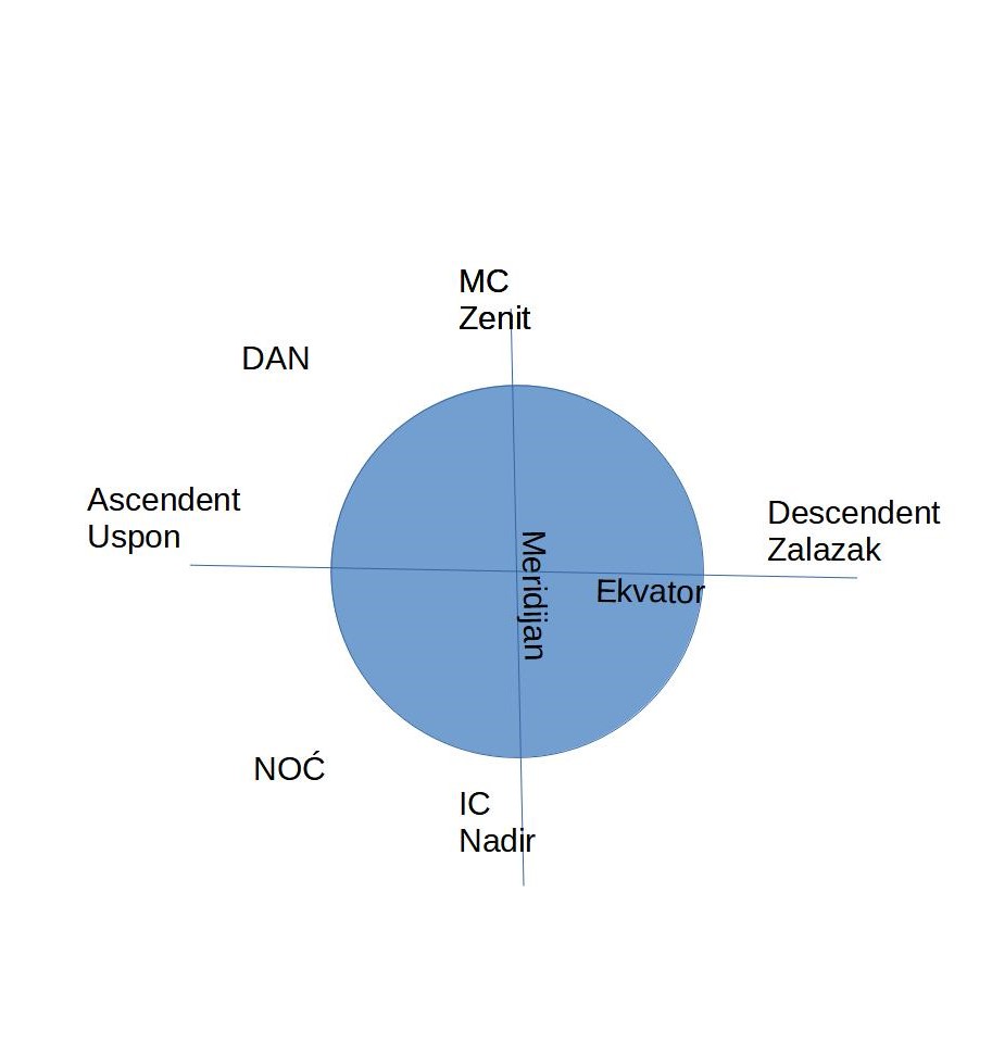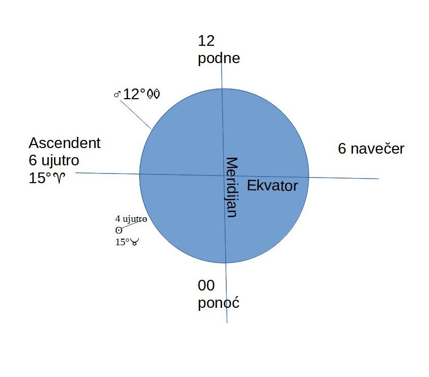 Mile Dupor kaže :Ascendent =granući stupanje ekliptike na istoku. Udo Becker ga definira kao točku na ekliptici koja u nekom određenom mjestu i u točno određeno vrijeme upravo izlazi na istočnom horizontu. Da bi bolje razumjeli ove definicije moramo znati da je horoskop (slika neba) podijeljen sa dvije osi, vodoravnom, koja se još zove ekvator ili horizont, i okomitom koja se zove meridijan. Vrhovi ovih osi su najvažnije točke horoskopa. Zemlja se oko svoje osi okrene u roku od 24 sata, tj, svaka dva sata dolazi do izmjene znaka u usponu. Znakovi imaju po 30°, što znači da se Sunce prividno svake četiri minute pomakne za jedan stupanj. Točka Ascendenta pokazuje koliko je Sunce bilo udaljno od svitanja u trenutku našeg rođenja. Dakle ako npr. Sunce izlazi na dan našeg rođenja u 6 sati ujutro, a mi smo se rodili u 4 sata ujutro, Sunce je udaljeno 2 sata od izlaska (Ascendenta). Ako znamo da 2 sata označavaju udaljenost od 30 stupnjeva, znači da ako je naše Sunce npr. na 15° bika da se Ascendent nalazi na 15ş ovna. Vladar horoskopa je Mars. Točka Ascendenta pokazuje vrijeme svitanja, zato se znak na Ascendentu još zove i granući znak. Vladar Ascendenta je vladar horoskopa. Pogrešno je znak na Ascendentu zvati Podznak. Vladar horoskopa ovisno o znaku i kući u kojoj se nalazi, kao i aspektima (osobito konjunkcijama) nas definira, puno jače od Sunčevog znaka. Kod analize horoskopa neki kažu da je svejedno od kuda se krene. Moje je mišljenje da bi, osobito početnik, trebao krenuti od najvažnije točke, a to je Ascendent i vladar horoskopa. Lakše ćemo doći do ispravnog zaključka ako razlučimo što je bitno i koje planete su jake u nekom horoskopu. Oznake: astrologija, ascendent |