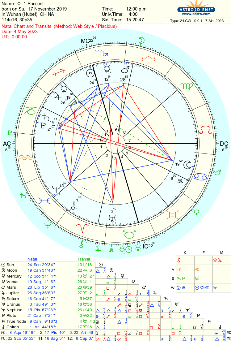 Statement on the fifteenth meeting of the International Health Regulations (2005) Emergency Committee regarding the coronavirus disease (COVID-19) pandemic (who.int) Agencija UN-a ne proglašava početak pandemije, pa ne može proglasiti niti kraj pandemije. Svaka zemlja prema svojim propisima proglašava kraj epidemije, a proglašenje kraja epidemije u Hrvatskoj, pojasnio je ravnatelj Hrvatskog zavoda za javno zdravstvo (HZJZ) Krunoslav Capak, ima svoju proceduru. "HZJZ ide prema tome da ministru zdravstva predloži, a on će onda na temelju tog prijedloga Vladi predložiti proglašenje kraja epidemije. Ako do toga dođe, onda će se razmotriti koje mjere ostaju na snazi. Više ih neće propisivati krizni stožer, nego Ministarstvo zdravstva". U svakom slučaju, proglašenja kraja epidemije očekujemo ovih dana u Hrvatskoj, a tako i u većem dijelu svijeta. U objavi koju sam napisala 2021. navela sam da se kraj epidemije očekuje u ožujku 2023. kada Saturn izađe iz znaka vodenjaka i kada Pluton uđe u vodenjaka, https://blog.dnevnik.hr/astroteme/2021/03/index.html. Vidimo se da stvar produžila do svibnja. Zašto? U prilogu je karta napravljena za datum (17.11.2019. Wuhan) prvog registriranog pacijenta od Covid-19 sa tranzitima na dan 4.5.2023. kada je objavljeno da je okončana globalna hitna situacija. Zanimljivo je pogledati brze tranzite kako su se lijepo posložili. Tranzitni Mjesec pada na natalni Mars, tranzitni Mars pada na natalni Mjesec. Tranzitni retrogradni Merkur je u opoziciji sa natalnim retrogradnim Merkurom. Merkur postaje direktan 15.5.23. Tranzitna Venera je u opoziciji sa natalnom Venerom i Jupiterom. Tranzitno Sunce će biti u egzaktnoj opoziciji na natalnim za 11 dana, tj. 16.5.23. Da li će to biti dan proglašenja kraja epidemije? Tranzitni Jupiter je u opoziciji sa natalnim Marsom, a tranzitni Sjeverni mjesečev čvor u konjunkciji sa natalnim Uranom. Tranzitni Saturn na 5 riba je u sekstilu sa Uranom na 3 bika. Tranzitni Uran je na 16 bika u trigonu sa natalnim Saturnom na 16 jarca. Budući da ne znamo Ascendent ne možemo odrediti vladara horoskopa, ali očito Uran igra važnu ulogu. Možemo zaključiti da nije dovoljan jedan veliki tranzit za početak ili kraj nečega, nego se i brzi tranziti moraju odgovarajuće posložiti. Veliki tranzit nam može biti orijentir, on pokazuje kada će otprilike nešto biti. Za veću preciznost treba pratiti svaki detalj. Oznake: pandemija, COVID, astrologija |