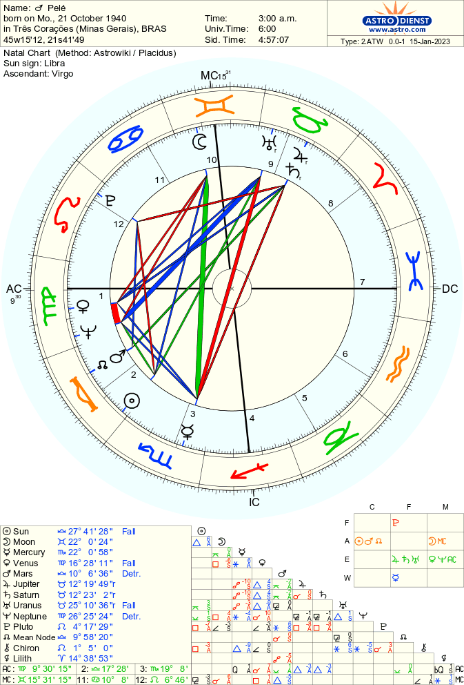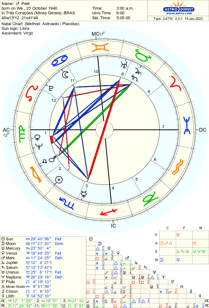 Nedavno je umrla nogometna legenda, Edson Arantes do Nascimento, poznatiji po svome nadimku Pelé. Podaci o vremenu njegovog rođenju nisu pouzdani, pa su na stranici https://www.astro.com/h/index_e.htm objavljena dva horoskopa. Više sam sklona ovom u kojem mu je Mjesec u znaku raka.