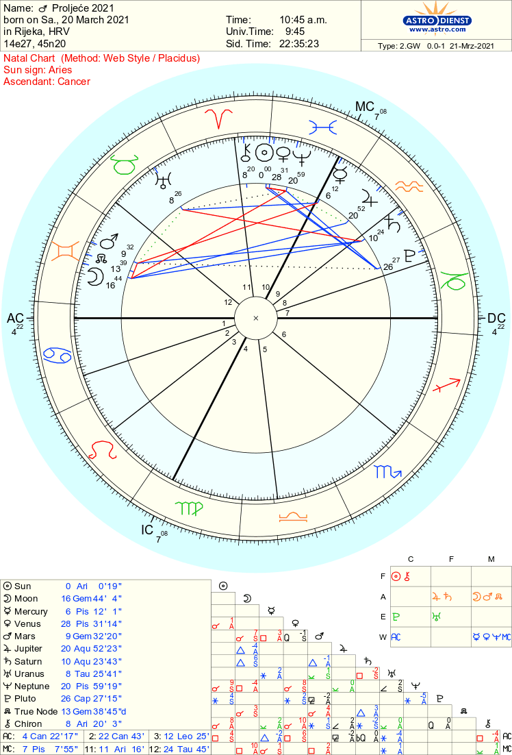 Ulaskom Sunca u znak jarca počinje zima. Na prvi dan zime ili zimski solsticij dan je najkraći u godini i od tada počinje rasti. Božić je blagdan slavljenja rođenja boga Sunca. To je dan kada Heraklo izlazi iz podzemnog svijeta nakon obavljenog 12. zadatka, hvatanja troglavog psa Kerbera. Tri Kerberove glave predstavljaju tri godišnja doba (nekada se godina dijelila na jesen, zimu i ljeto). To što mi slavimo novu godinu 1.1. ili to što slavimo Božić po gregorijanskom kalendaru 25.12., a po julijanskom 6.1. rezultat je nepreciznosti i grešaka u proračunima koje su se kroz stoljeća nagomilale, pa su nastale razlike od nekoliko dana. Zima je u Rijeku stigla 21.12.2020. u 11.05 sati i obilježena je velikom konjunkcijom Jupitera i Saturna na 0ş vodenjaka. Ascendent i Mjesec su u ribama. Prema DHMZ zima 2021 na našem području bila je vrlo topla i kišna. https://meteo.hr/klima.php?section=klima_pracenje¶m=ocjena Proširio se strah od epidemije i potresa, za bolje razumijevanje ovih fenomena poslužiti će iskustvo španjolske gripe. https://www.youtube.com/watch?v=eVRCAWvIErs Prvi svjetski rat počeo je 28. 6. 1914. ulaskom Plutona u znak raka. 13. siječnja 1915. oko 32.600 ljudi poginulo je kad je potres magnitude 7 po Richteru pogodio grad Avezzano u središnjoj Italiji. Saturn (veliki malefik) je bio u konjunkciji sa Plutonom u proljeće 1915. Mars je u studenom 1917. ušao u znak djevice gdje je boravio do lipnja 1918. (izuzetno dugo), a Jupiter je bio u znaku blizanaca. Nagađa se da je virus gripe pušten iz francuskog laboratorija radi korištenja u vojne svrhe. Prvi slučajevi španjolske gripe zabilježeni su u siječnju 1918. Jupiter (veliki benefik) prelazi u znak raka i dolazi u konjunkciju sa Plutonom u kolovozu 1918. Mir je potpisan 11. 11. 1918. Gripa je imala nekoliko valova. U kolovozu 1919. Jupiter prelazi u lava, a Saturn u djevicu. Zadnji val je bio potkraj 1919. kada je Mars (mali malefik) bio u konjunkciji sa Saturnom u djevici. U veljači 1920. Uran je prešao u ribe, to je bio kraj gripe. Zajedničko tim događajima i onome što nam se sada desilo je dugački boravak Marsa (6 mjeseci) u jednom znaku i konjunkcija Saturna, Jupitera i Plutona. Neki astrolozi su predviđali i mogućnost većeg globalnog sukoba. Pojava korone zabilježena je u prosincu 2019. kada je prvo Saturn došao u konjunkciju sa Plutonom, a zatim i Jupiter u znaku jarca. Tijekom svibnja Jupiter, Saturn i Pluton započinju retrogradno kretanje (popuštanje mjera). Mars boravi u ovnu od lipnja do kraja 2020. Jupiter i Saturn počinju direktno kretanje u listopadu (vraćanje mjera) i susreću se 21.12.2020. kada oboje mijenjaju znak, što se očitovalo kroz smanjeni broj zaraženih osoba i početak primjene cjepiva. Sredinom svibnja 2021. Jupiter prelazi u znak riba, svoje sjedište, i oslobađa se za kratko vladavine Saturna. U tom periodu znanstvenici će dobiti slobodu reći pravo mišljenje, ali će biti brzo ušutkani. 20.6.21 Jupiter započinje retrogradno kretanje, a Mars dolazi u opoziciju sa Saturnom Krajem srpnja Jupiter se opet vraća u vodenjaka. Prolazak Marsa kroz znak škorpiona tijekom 11. i 12. mjeseca 2021 će biti osobito naporan zbog kvadrata sa planetama u vodenjaku i opozicije sa Uranom u biku. Tek u siječnju 2022. kada Jupiter konačno prijeđe u znak riba ćemo moći početi vjerovati našim liječnicima. Nažalost, Jupiter koji obično boravi u znaku oko godinu dana, u svom sjedištu će se zadržati samo do svibnja 2022. što znači da ćemo njegove benefite osjećati veoma kratko. Korone bi se mogli riješiti tek u ožujku 2023. kada Saturn izađe iz vodenjaka i kada Pluton prijeđe u taj znak. A tada možemo očekivati i početak oporavka ekonomije. Kada su teške planete u konjunkciji ili mijenjaju znak to se često osjeti kroz pojačanu seizmičku aktivnost Zemlje. Gdje će biti potres ovisi o horoskopu grada. Kako se sve dešava na prvi dan zime, znači da je čitava zima obilježena tim astronomskim događajem. Negiranje činjenice da gravitacija planeta može uzrokovati potrese na Zemlji i da se potresi mogu predvidjeti je dogma koja ne priliči znanstveniku. Više puta smo čuli na tv kako se potresi ne mogu predvidjeti, isto tako smo mogli svjedočiti brojim potresima zadnjih mjeseci širom planete koje možemo pripisati konjunkciji Jupitera, Saturna i Plutona. https://net.hr/danas/znanost/najcesce-za-ustapa-ili-mladaka-mjeseceve-mijene-utjecu-na-razorne-potrese/ Mundana godina počinje kada Sunce uđe u znak ovna, što je prvi dan proljeća. Aspekti na taj dan ukazuju kakvi će biti slijedećih 12 mjeseci. Proljeće u Rijeci je počelo 20.3.2021. u 10.45. Ako je suditi po prvom danu proljeća godina će biti hladnija i vjetrovitija od prosjeka. Zanimljivo je da ascendent pada na 4ş raka gdje se nalazi Sunce Hrvatske, a Mjesec je na 16ş blizanaca, u opoziciji sa Mjesecom Hrvatske na 18ş strijelca. Ovi aspekti ukazuju da su pred nama veoma važni događaji. Tim više što Hrvatska prolazi kroz Saturnov povratak. Neke bitne stvari su se već desile, umro je Milan Bandić, počelo se odmotavati korupcijsko klupko oko braće Mamić, pred nama su lokalni izbori, ali to nije sve. Prvo polje u horoskopu neke zemlje predstavlja narod. U horoskopu Hrvatske mi, narod predstavljeni smo Jupiterom u lavu u konjunkciji sa Marsom, što znači da smo ratnički, sportski narod, ali uvijek u sukobu sa nekim autoritetom zbog opozicije sa Saturnom. Ove godine taj sukob će biti osobito naglašen, jer se Saturn vratio na svoju početnu poziciju. Konjunkcija Jupitera i Satuna desila se točno na vrhu natalne druge kuće koja predstavlja financije, što je jako važan aspekt. Ovo je vrijeme restrukturiranja financija, nismo mogli nastaviti po starom, promjene se neizbježne. Kako Saturn i Jupiter u godišnjem horoskopu padaju u deveto polje, to bi mogli tumačiti kao aktiviranje trgovine i poslova sa inozemstvom od kojih će neki izazvati i gubitke, ipak će biti više
