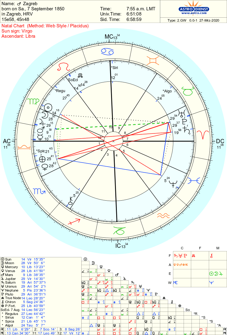 Nikola Tesla rođen je u Smiljanu u noći sa 9. na 10.7. 1856. prema legendi, u ponoć. Mislim da se ipak radi samo o legendi, i da je rođen nešto ranije, odnosno da mu je Ascendent u ovnu, a ne u biku, kako je objavljeno na Astrodienst-u. U prilogu je link na zanimljivi, šaljivi dokumentarac Roberta Knjaza.
