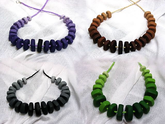 Konačno da vam i ovo pokažem. Počela sam sa izradom ovih ogrlica prije 2 mjeseca. Najgore je bilo čekati da se glina osuši. Nešto za proljetne dane i proljetne noći.Ogrlice na prvoj slici su od keramičlih perli i sitnih perlica između njih, a ogrlica na drugoj slici, crna, kombinirana je od keramičkih i drvenih perli na crnoj špagi. Keramičke perle su bojane ručno akrilnim bojama.