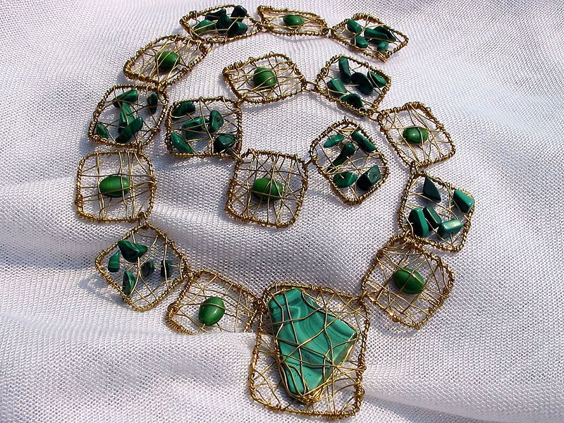 Zelena ogrlica je napravljena od mesingane žice, malahita i staklenih perli. Za nju su mi trebala 2 dana.