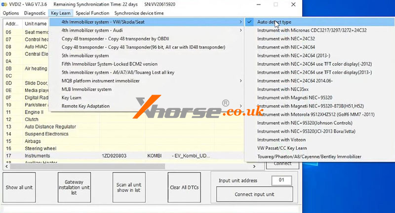 Key learn >> 4th immobilizer system - VW/Skoda/Seat >> Auto detect type >> Diag >> Read immo data >> Login Method 1 >> NEXT