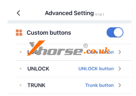 If the vehicle has special functions(e.g., hold lock to raise windows, double-click trunk to open, press and hold lock to remote start), you can set custom key combinations through [Advanced Settings - Custom buttons]. This allows the app to perform these special functions. Refer to the on-screen instructions for specific adjustment methods, as shown in the picture.