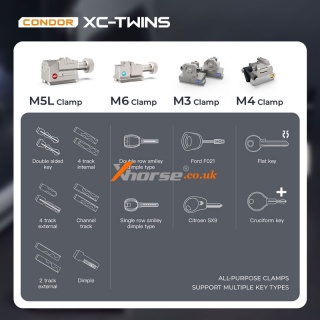 The CONDOR XC-TWINS comes equipped with four smart clamps - M5L, M6, M3, and M4 clamp (optional) - each designed to handle specific key profiles with unmatched accuracy: