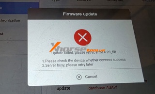 18.11.2025.Problem: The Xhorse VVDI Key Tool Plus Pad encounters a firmware update failure with the message "Update failed, please retry! error=20_58"