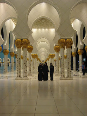 Druga stvar koja mi je natjerala donju celjust da padne do poda (mramornog) i ostane se tamo vuci zamnom dok ja osupnuto koracam je bila dzamija - Sheikh Zayed Grand Mosque. D. je vec pripremila tri abaye za nas iz svoje kolekcije da ne bi imali problema s ulaskom (zasto, ipak necu napisati sve detalje da ne bi neki dusebriznik se nasao uvrijedjenim, no vjerujte bi bilo je jako zabavno i D. je jos jednom pokazala da je beskonacno vise kul no sto bi itko mogao pomislit). I dok je ona parkirala Igora (auto, pogotite tko mu je pred godinu dao ime! Daa, bingo!) meni je celjust pocela padati sve dok konacno nije opala. Tesko je rijecima opisati kako to cudo izgleda u mraku obasjano reflektorima, pa cu samo revi vauu.