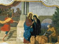 Trećeg dana bijaše svadba u Kani Galilejskoj. Bila ondje Isusova majka. Na svadbu bijaše pozvan i Isus i njegovi učenici. Kad ponesta vina, Isusu će njegova majka: "Vina nemaju." Kaže joj Isus: "Ženo, što ja imam s tobom? Još nije došao moj čas!" Nato će njegova mati poslužiteljima: "Što god vam rekne, učinite!".