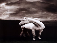 Bijeli konj sjuri se iz lijevoga kuta nejasne slike.