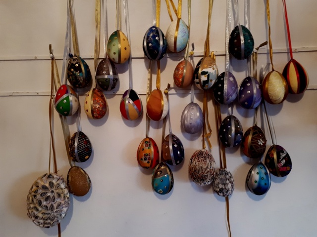 pisanice S obzirom da za cca mjesec dana putujem prihvatila sam se posla jer lijepo je pokloniti nešto drukčije. Ovo su ovogodišnje. Na fotki su i tri od prije nekoliko godina napravljene od trakica časopisa. Neki blogeri su ih već vidjeli, ali kako su u stalnom postavu na zidu nisam ih skidala. Ostale su obložene svilom bez ljepljenja. Koga zanima povijest pisanica klik gore na "pisanice". |