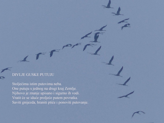 Prekjučer me iznenadio zvuk iz visine, a znatiželjna vidjeti o čemu je riječ ugledah veliko jato divljih gusaka. Kako to često biva, fotić na dohvat ruke, hvatam njihov let uz kliktaje i naravno odmah upisujem novu gogyoshi pjesmu. Možda vam se svidi? |