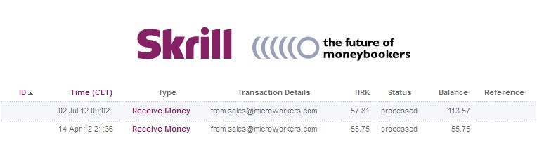 Stigle su dvije isplate zarađenog novca sa MicroWorkers-a. Za isplatu sam koristio sustav Skrill, poznat prije pod nazivom Moneybookers jer ljudi javljaju da imaju problema s isplatom na Payza, prije poznatom kao Alertpay. Više o Skrill-u ću pisati u idućem postu!