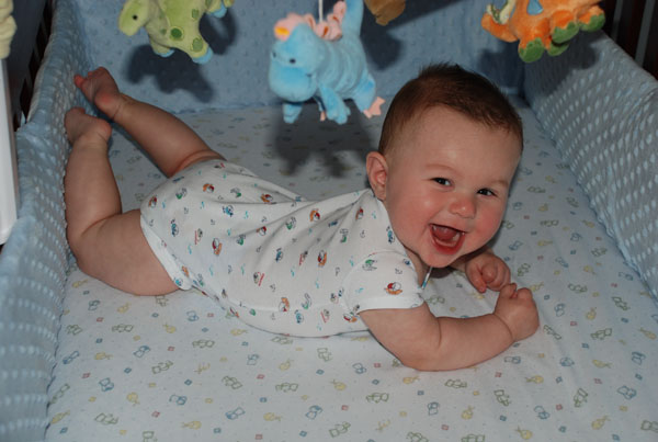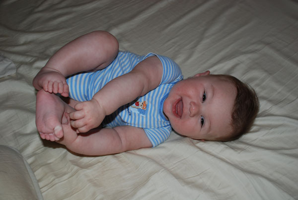 Nevjerovanto ga je gledati kako svaki dan nauci nesto novo. Stalno nas iznenadi sa novim zvukovima (trenutni omiljeni zvuk je “da-da-da-daaa”), novim pokretima. Gledam ga kako drzi igracke, kako ih dohvati i okrece, kako jednu ostavi a drugu uzme, a znam da to nije mogao prije samo 3-4 sedmice. Sad je vec poceo i da negoduje i place kad mu uzmemo igracku s kojom se igra ili kad mu ne damo nesto sto zeli. A ono sto najvise zeli je daljiski, nije bitno koji, bitno je samo da je daljinski. Ili telefon. Takode uziva da zgrabi novine, magazin i knjige pa mi je sad problem kad mu citam jer ga vise ne mogu drzati u krilu inace ce nam sve knjige imati poderane listove. Pravi je mali vragolana, a postaje sve vjestiji i upusta se u nove pustolovine i vragolije. Ali se ne mozemo ljutiti na njega sta god da on uradi jer nam se stalno smije, a kad vidimo njegov osmijeh istopimo se istog trena. Meni je od svega najvise nevjerovatno kako je znatizeljan – sve zeli da vidi, da dotakne, uvijek se okrece na sve strane da vidi sta se desava. A zanimljivo je kako najvise “prica” kad je sam bez ijedne igracke. Onda se zabavi sa svojim rukama, prsticima, stopalima i prica li prica. Dragi i ja se stalno cudimo kako smo uspjeli da napravimo nesto tako savrseno. cerek