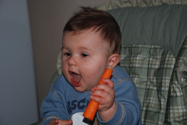 Dobili smo prvi zubic!!! Jedinica, dole desno - pronasla sam ga jutros dok je Edo pokusavao da mi gricka prist. Na donjoj desni se vidi mala bijela tackica, a pod prstom se osjeti kao mala iglica. A Edo cak i nije toliko rasplakan, nista vise nego obicno, o on obicno ne place mnogo osim kad je gladan. Danas smo cak nas dvoje isli u prodavnicu na jedno sat i po, a on je kao pravi mali sarmer bacao osmjehe svima u prodavnici i pokusavao da dohvati stvari sa polica :) Mislila da male bebe placu non-stop kad im zubi rastu, pa sam sad sva happy sto to nije tako. Prvi zubic je stiga prvog avgusta - bice lako zapamtiti. ![]() |
