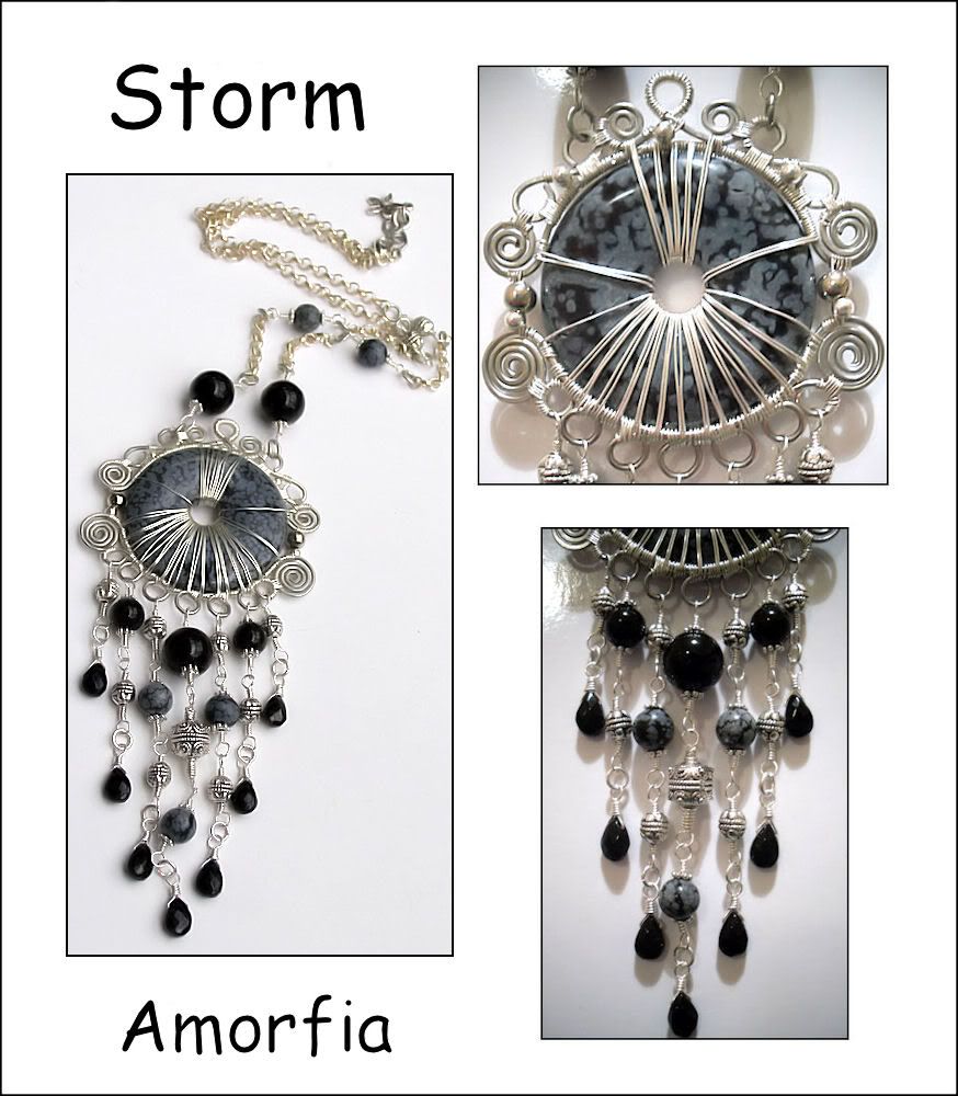 Ogrlica napravljena od snowflake obsidiana, oniksa, metalnih perli, lanca, posrebrene i hobi žice.