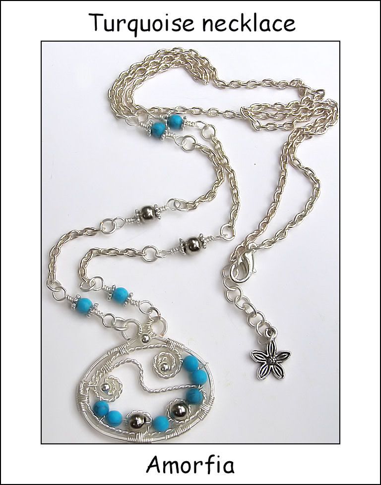 Ogrlica napravljena od posrebrene žice, tirkiza, metalnih perli i lanca.