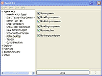 Tweak FX je snažan konfiguracijski alat za Windowse. Za razliku od stotina tzv. "tweaking" programa, ovaj program koristi plagine koji značajno proširuju njegove mogućnosti. Do sada ima već više od 40 plagina. U pravilu sa jednim možete promijeniti dvije do tri postavke, što znači da ukupno možete modificirati više od 150 postavki. A to je tek početak njegovih mogućnosti, jer se svakih nekoliko dana pojavljuje novi plagin. Program možete preuzeti sa autorove stranice.