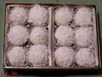 Oko 35 komada 30 dkg bijele čokolade, 10 dkg slatkog vrhnja, 10 dkg maslaca, 2-3 žlice vinjaka ili konjaka. Preljev: rastopiti 10 dkg bijele čokolade. Čokoladu rastopiti na vodenoj pari, dodajte maslac, slatko vrhnje i na kraju vinjak. Ravnu površinu pokrijte folijom, na nju razvaljajte masu na debljinu od oko 2 cm, prekrijte plastičnom folijom i ostavite u hladioniku 24 sata. Razrežite kockice 1x1 cm i oblikujte kuglice. Rastopljenu čokoladu ohladite da bude gusta ali još tekuća i prelijte kuglice. Okvirna cijena:30 kuna Okvirno vrijeme pripreme: 30 minuta (ne računajući vrijeme hlađenja) |