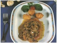 Odrezak 200 gr., 100 gr. šampinjona, brašno, vrhnje, senf, vegeta ,sol, peršin, sir trapist. Odrezak pržiti na ulju i kada je napola gotov staviti ga u drugu tavu da se nastavi peći. U prvu tavu staviti sjeckane šampinjone, malo brašna i pirjati. Zatim dodati vrhnje, malo senfa, sol, vegetu, peršin i zaliti goveđom juhom. Taj sos s gljivama preliti preko odreska, staviti sir trapist narezan na kriške. Kao prilog može se staviti, grašak, mrkva ,krompir ,riža. Okvirna cijena : 30 kuna Okvirno vrijeme pripreme: 30-40 minuta. |