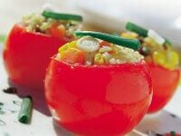 Za 4 osobe: 4 velike rajčice, 4 jaja, 4 češnja češnjaka, malo peršina, sol. Rajčicu oprati i napola izdubiti, u svaku udubinu dodati malo usitnjenog češnjaka i list peršina. U svaku razbiti po jaje i posoliti. Zapeći 15-tak minuta na 160-180 C. Okvirna cijena: 10 kuna Okvirno vrijeme pripreme: 20 minuta |