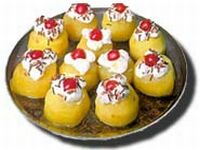 1/ kg mljevenog keksa Petit, 1margarin, 150 gr.šećera, 4 žlice kakaa, mlijeka i ruma dodati po potrebi. Sve sastojke zajedno zamiješati pa praviti kuglice koje se stavljaju na dno cijedila za limun, i oblikuje piramida koja je u unutrašnjosti prazna. Fil: 4 žumanjka, 100 gr.šećera u prahu, 200 gr.rastopljene čokolade,1 bjelance,1/2 maslaca Sve zajedno umutiti te filati piramide. Dno piramide zatvoriti oblatnom čiji krug vadimo čašom. Okvirna cijena: 30 kuna. |