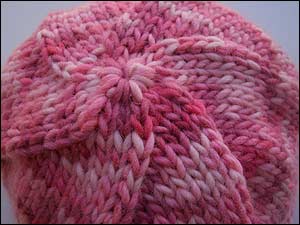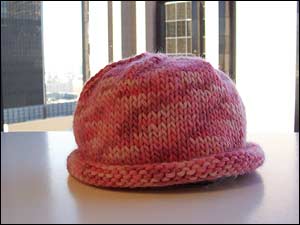Details: One pink hat, made from the easy roll-brim hat recipe.