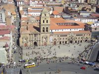 ![]() ![]() Slikajemo ko' mutavi, nakon čega pada prijedlog da potražimo panoramski pogled; odmah se sjetih Buenosa i promašenog promrzlog tumaranja u kišno nedjeljno jutro, no ovaj put je to pun pogodak: relativno lagano nalazimo petozvjezdični (!) hotel President i pičimo liftom na 25.kat. Izlazimo pomalo plaho (5 zvjezdica, ej!), a kad gore jedno 10-tak upicanjenih konobara i isto takav, ali potpuno prazan restoran. Iako nas troje izgledasmo ko zadnji klošari (ja npr.u šuškavcu, ispranoj majici s kapuljačom, prevelikim zmazanim samtericama i treking-cipelama), jedan od konobara nas skroz ljubazno odfurava na ostakljenu terasu i donosi nam po malu Paceňu (pivu), a mi se ko mutavi bacamo na slikavanje, jer pogled je apsolutno fantastičan: sunčan dan, iznad nas sunčano nebo bez oblačka, a pod nama kao na dlanu glavni trg sa ludilo starom katedralom sv. Francesca, prometni kaos, okolna brda na koja od neožbukanih kuća više ni žilet ne stane te u daljini ogromna planinčuga pod snijegom. Malo smo se stisli koliko će nam u petozvjezdašu naplatit pive-tričavih 12 bolivijanosa (nekih 8-9 KN)... Kasnije pičimo u Swiss-Bolivian adventure agency riješit sutrašnji dan-D, zatim po preporuci vodiča u neki birc di na ulazu stoji brale s pendrekom, dok unutra isključivo gringosi srču fensi-kave i mumaju razne điđi-miđi meksičke smotuljke. Činimo to isto, te u 2:00 startamo s obilaskom grada na dabldekeru. Usput pada primjedba da nam očito nije dosta buseva, pa nam još i za obilazak treba. Međutim, uopće nije bilo loše! Recimo, evo par informacija koje smo čuli tijekom obilaska: - prosječna doživljena starost u Boliviji je 63, a za penziju treba doživit 65 godina (!?!) - žene u prosjeku imaju po 5-oro djece, najviše u J.Americi - žene nose one smiješne cilindre jer su im jednom davno Englezi prodali foru da je to guba A vidili smo i zloglasni stadion, di je FIFA zabranila igranje zbog nadmorske visine nakon šta je Bolivija pobijedila Brazil 2:0. Reka bi s pravom, jerbo nama svaki nagli pokret pari da smo upravo odvalili maraton, a di je još pičit 90 min.protiv nogometne velesile ka šta je Bolivija! ![]()