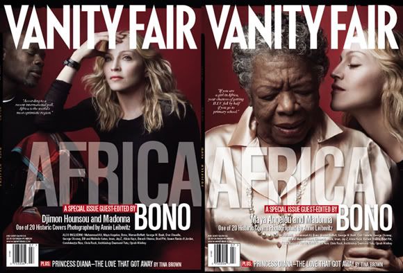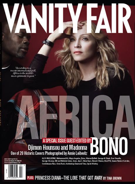 Mnoge poznate ličnosti su snimile predivne naslovnice za srpanjsko izdanje časopisa 'Vanity Fair'. Annie Leibovitz je uradila fotografije 30.04. ove godine u Londonu i htjela je prikazati izazov, obećanje i budućnost Afrike. Zvijezde kao Madonna, Bono, Oprah i drugi imaju po dvije naslovnice. Sa Madonnom na naslovnicama su glumac Djimon Hounsou ('Blood Diamond') i pjesnikinja Maya Angelou. Madonna osim snimanja albuma i filma 'Filth And Wisdom', također radi sa režiserom Nathan Rissmanom na dokumentarcu o siromaštvu u afričkoj državi Malawi.