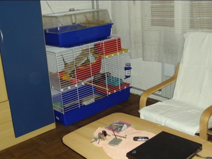 Kavez je smjesten u jednom uglu, bez propuha i bez da na njega izravno padaju sunčeve zrake. Velik je 110x90x70 cm.