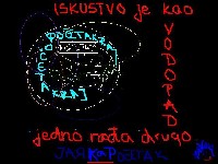 moj nos je centar. oko njega vrte se boje. narančasta prepliće plavu, proljeva se ljubičastom, preobrće bijele u male crvene. gle, žuta tamo pluta na balončiću. hehe, balončići posvuda. volim balončiće. igraju se skrivice - nestanu uz okret, pa se uz prodornu buku ustanu iz bubnja. drže se za ruke i vrte u krug. obrću sobu brzinama autobana, oktagonalno mrdaju podove. pridržavam se vakumom nosa. on počinje da raste. mahnito pritisćem dugme, ali ništa se ne dogada. vrat počinje da se okreće oko ramena. stopala su mi se popela na glavu. plešu u ritmu sekundaljke na plafonu. bubanj ponovo udara iz nicega. balončić crvena balončić zelena balončić sarena pa opet kako se, zaboga, gasi ova veš mašina??? pobježe mi voz. |