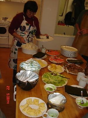 Skoro gotov stol sa puno sastojaka i pokazivanje kako se mota te maki.