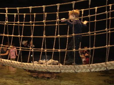 Pentranje po konopu tj mosticu preko jednog bazena sa ja mislim morskim galebima.
