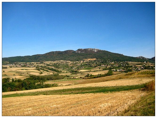 Spuštanje u kotlinu sela Jezerine, pogled na sjeverozapad. U daljini vidljiv stožasti profil brda Vijenac iznad sela Galin, s vrhom Štula (575m).