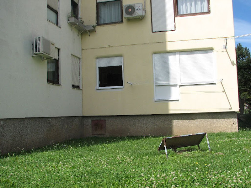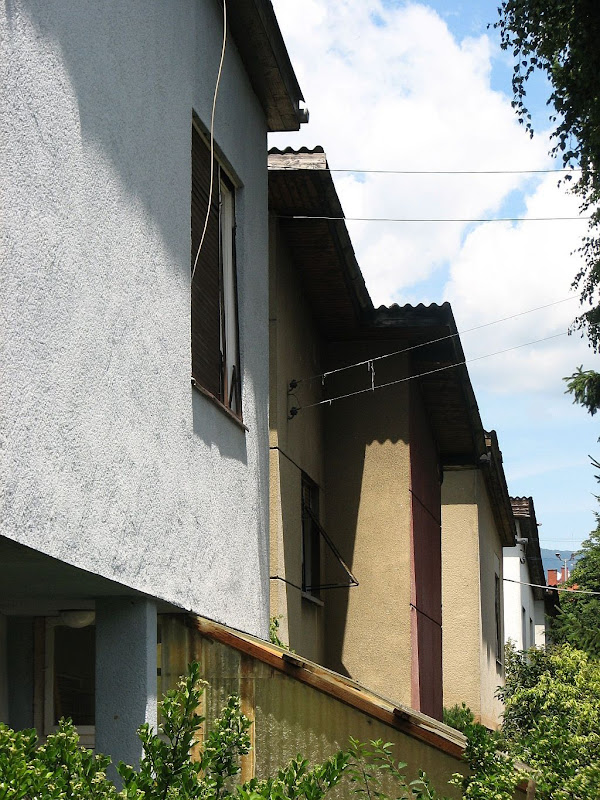 U mom postu od 18.05.2009. već sam vas upoznao sa jednom "polukućom", u Baštijanovoj ulici. No, to nije jedina takva kuća - njezina još poznatija "kolegica" se nalazi u Vrbanima (ulica Vrbani), dobro vidljiva sa Zagrebačke avenije, između potoka Vrapčaka i Petrovaradinske ulice. A električni stup ispred nje još samo pojačava vizualni dojam dvodimenzionalnosti ...