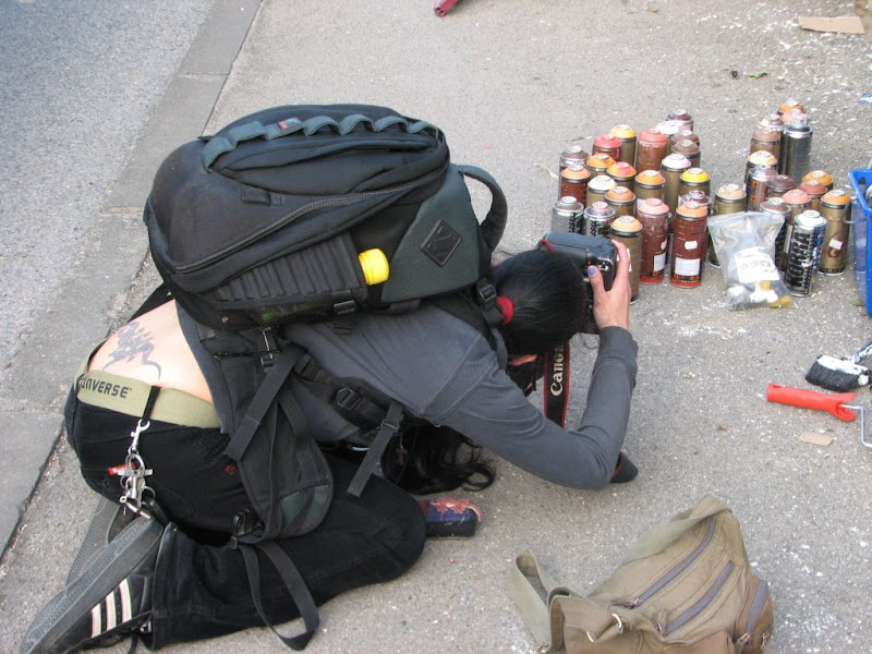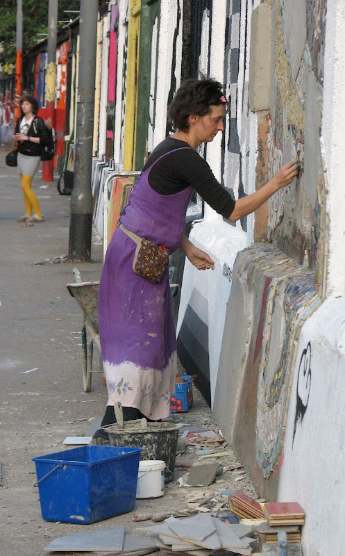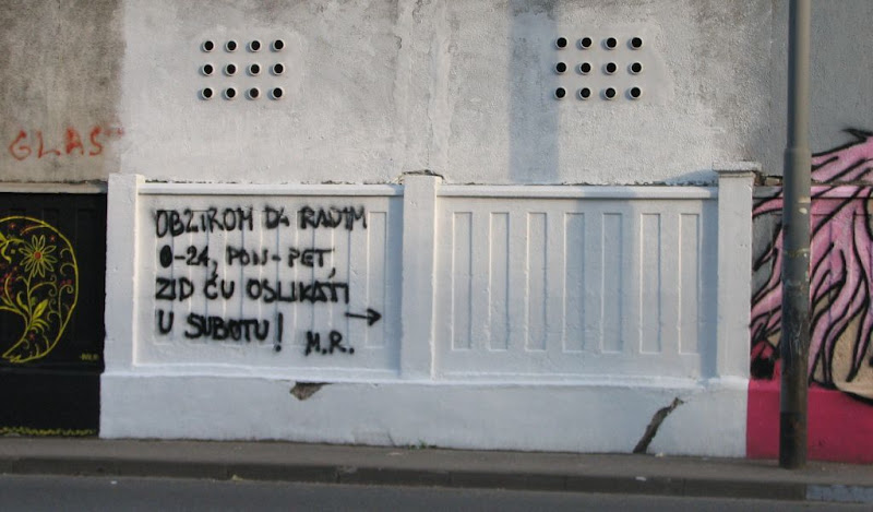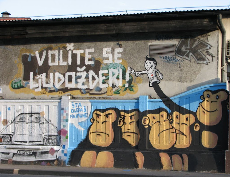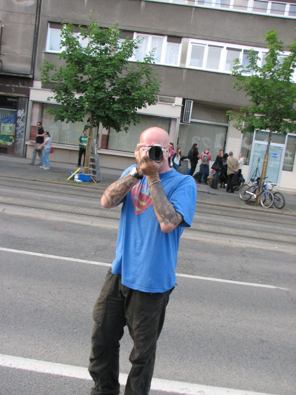 Hura, The Zid u Branimirovoj je otvoren! - dio prvi![]() Snimio: Vanja Ovog petka, 14.05.2010., prava "brijačnica" nije bila iza ugla, već baš u Branimirovoj! I to ne samo radi nekoliko stotina metara novoofarbanog i novim slikama ukrašenog zida, već i radi dobrih vibracija koje su se širile ulicom! Branimirova ulica je vrlo rijetko u centru pažnje i ovaj šareni zid, šareno mnoštvo koje se motalo oko njega i "šarena" atmosfera koja je obavila tu ulicu bila je u potpunom kontrastu sa njenom inače sivom i bezličnom pojavom - nadam se da će biti entuzijazma, vremena, mjesta i novca za oživljavanje i nekih drugih inače sivih i bezličnih dijelova grada! ![]() Snimio: Vanja I, stoga, hvala - "Muzeju Ulične Umjetnosti", projektu udruge "Centralna jedinica", čiji je ovo prvi projekat - željno očekujem slijedeće! (detalje ovoga možete naći i na "Facebooku"!) Točno u 18h, na početku otvorenja Zida, na Tomislavovom trgu je zasvirala limena glazba ZET-a ... potajno sam se nadao da će zasvirati "Anarchy in UK", "Freestyler" ili nešto od Pixiesa no, repertoar je ipak bio klasičan: od koračnica do "When the Saints Go Marchin' In". Ipak, bila je to zgodna neformalna kulisa za otvorenje: uniformirani muzičari sa svojim metalnim instrumentima kao pozadina šarenom mnoštvu uličnih umjetnika koje se najlakše prepoznavalo po bojama umrljanoj odjeći, pirsinzima i tetovažama, biciklima i dreadlocksima. Uz sudionike i znatiželjne slučajne prolaznike ovaj skup je privukao pažnju i grupice azijskih turista kojima je cijeli taj miš-maš sigurno bio vrlo zanimljiv!![]() Snimio: Vanja ![]() Snimio: Vanja ![]() Snimila. Bubamara šarena ![]() Snimio: Vanja ![]() ZET-ova glazba vs. ZET-ov tramvaj. Snimio: Vanja ![]() Snimio: Vanja ![]() Nema sumnje, i ona je sudjelovala u radu na Zidu: pofarbane hlače + bicikl. Snimio: Vanja![]() Ovaj virtuoz spreja je vjerojatno po prvi puta dočekao da mu završetak rada na muralu obilježava limena glazba sa koračnicom. Snimio: Vanja Bio je tu kraći govorčić zahvale svima koji su učestvovali u projektu i podržali ga (održala ga je voditeljica projekta, mislim da sam čuo ime Ivana), podjela prigodnih majica i papirnatih bedževa ... ![]() Prigodni govorčić. Snimio: Vanja ![]() Nadahnute voditeljičine riječi. Snimio: Vanja ![]() Zajednička fotka prisutnih sudionika. Snimio: Vanja ![]() Podjela majica i bedževa na štandu sponzora "Iskona". Snimio: Vanja ![]() Nina iz dječjeg kreativnog TV-kutka je također dobila bedž. Snimio: Vanja ![]() I sponzorski baloni su završili u kanti boje. Snimio: Vanja ... a onda su svi krenuli ka njegovom veličanstvu Zidu! Počeo je mimohod: s jedne strane je bio Zid, uz koji su još tu i tamo neki od sudionika dovršavali svoje radove praćeni budnim okom fotografa kojima je ovo bio bogomdani event ... a sa druge strane su bili oni koji su svoje radove već dovršili, njihovi prijatelji, prolaznici znatiželjnici, stanari, mladi i stari. To je bio jedan od tih rijetkih trenutaka kada se Branimirovom nije žurilo od točke A do točke B već se uživalo u njoj, bilo je vrlo lijepo vidjeti grupice ljudi kako gledaju i komentiraju Zid ili jednostavno pričaju o bilo čemu ... a to je bio jedan od ciljeva projekta, oživjeti ulicu. ![]() Carstvo boja. Snimio: Vanja ![]() Ovaj dio zida će se zasigurno sviđati djeci - ne samo radi pokretnih okica i nalijepljenih stakalaca! Snimio: Vanja ![]() Portret sa omiljenim muralom. Snimio: Vanja ![]() "Oko" i njena horror slikovna priča. Snimio: Vanja ![]() Sikstinska kapela i njen autor na Zidu. Snimio: Vanja ![]() "BBB" ne mora više značiti samo "Bad Blue Boys". Snimio: Vanja ![]() "Misli van formata", još jedan programatski natpis! Snimio: Vanja ![]() Majmunska posla. Snimio: Vanja![]() Hoće li ovaj dio Zida ostati ovako bijel i nakon subote? Današnja kiša nije baš pogodna za farbanje Snimio: Vanja![]() Ovaj nam se smije odozgo! Snimio: Vanja ![]() Autor utopljen u šarenilu. Snimio: Vanja ![]() Nina je još slagala mozaik - to je zaista veliki komad posla! Snimio: Vanja ![]() Nina na poslu. Snimio: Vanja ![]() Još jedna programatska poruka, ovaj puta na majici. Snimio: Vanja![]() Na poslu. Snimio: Vanja ![]() Ovo je zaista poveća paleta! Snimio: Vanja ![]() Ovakvi motivi privlače fotografe ... Snimio: Vanja ![]() Kao što rekoh ... Snimio: Vanja ![]() ... pa nisam ni ja mogao odoljeti. Snimio: Vanja![]() Visinski rad. Snimio: Vanja ![]() Ekipa "Transfera" dovršava lijepljenje folija ... Snimio: Vanja ![]() Objektiv u objektiv sa njihovim "šefom", velikim ljubiteljem ulične umjetnosti, ali i ovog bloga Snimio: Vanja![]() Nekima je trebal i šarafciger za dovršenje djela - nadam se da će se ovi fora dodaci znati oduprijeti vandalima! Snimio: Vanja |
