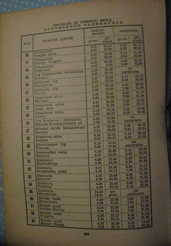... te autobusnog voznog reda. osobito su zanimljive linije sa Trga bratstva i jedinstva ("Cvjetni plac") za Žitnjak i sa Trga Oktobarske revolucije ("Trešnjevački plac") za Špansko.