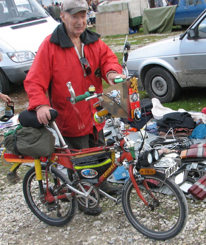 Pred kraj posjeta sreli smo i ovog simpatičnog gospona sa njegovim neobičnim biciklom. Sin je komentirao kako je sigurno baš na sajmu nabavio sve te oznake marki auta koje ima na njemu. wink